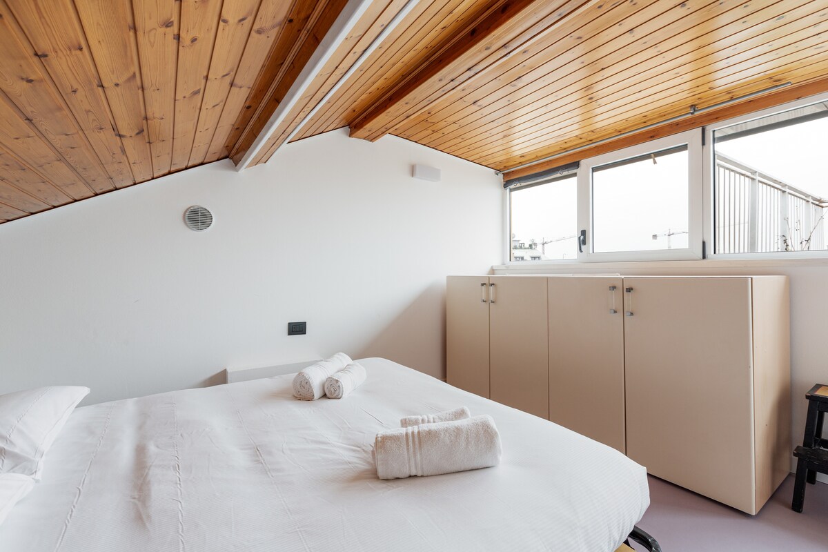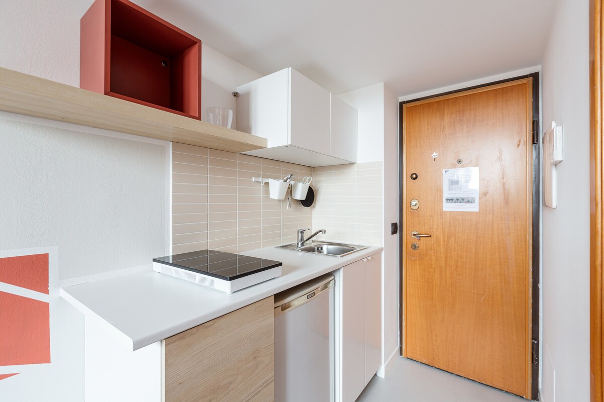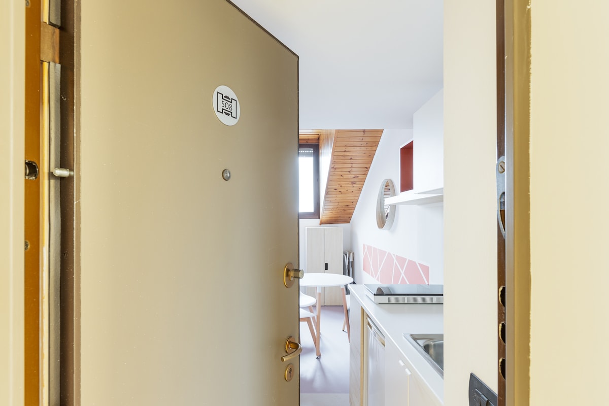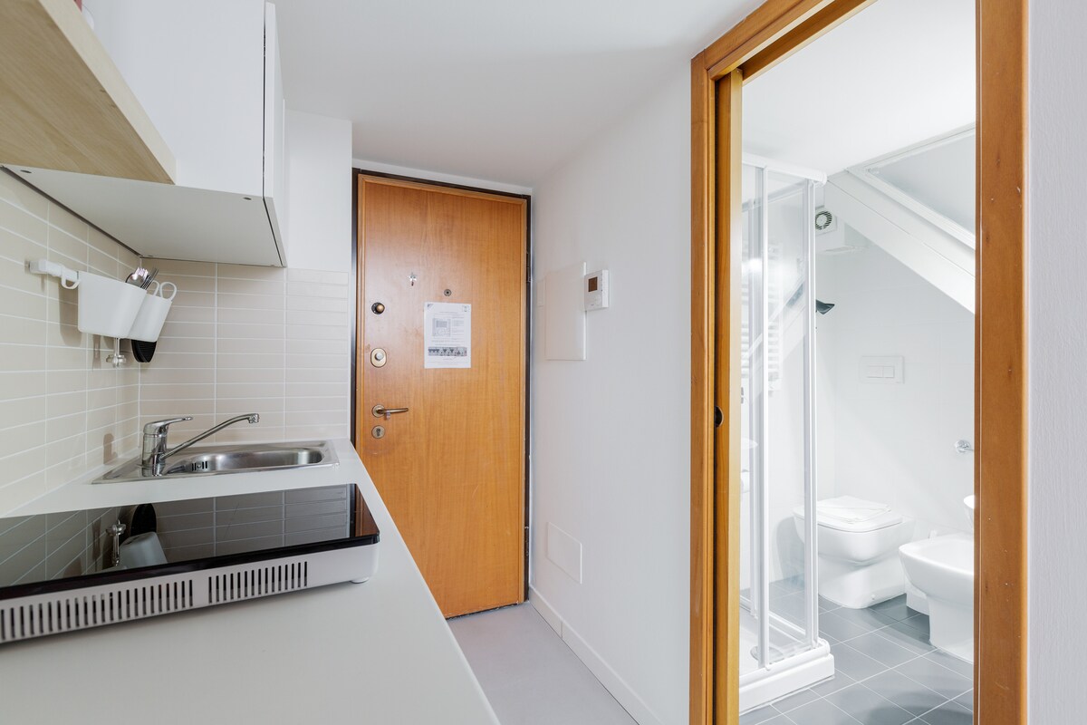 Apartment number 508 of approximately 25m2 is located on the fifth floor of an elegant Milanese building with concierge and a lift that reaches the fourth floor. The top floor must therefore necessarily be climb on foot. It has all the main comforts and is organized as follows:- LOWER LEVEL with relaxation area with sofa bed and small kitchenette with 2-burner hob, kettle, small fridge.