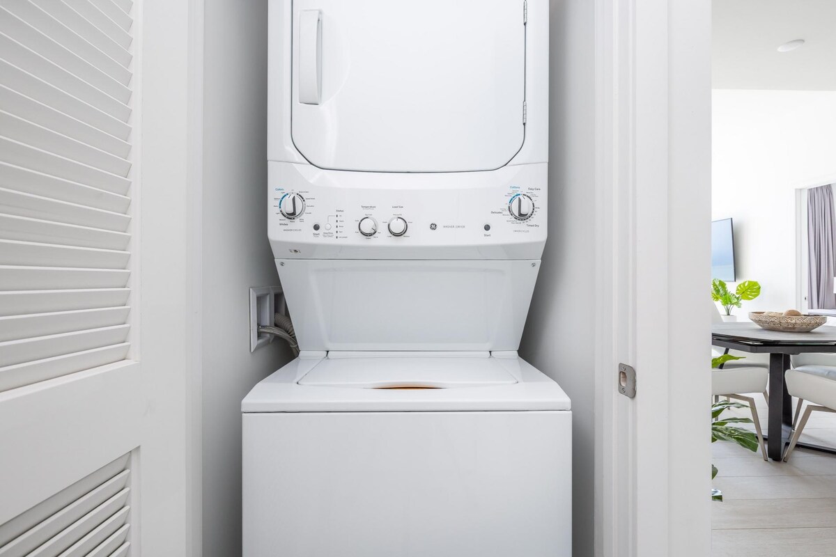 Complete kitchen with modern appliances, in-unit washer/dryer, dedicated workspace for remote work, and all essentials provided including beach gear for immediate ocean enjoyment.