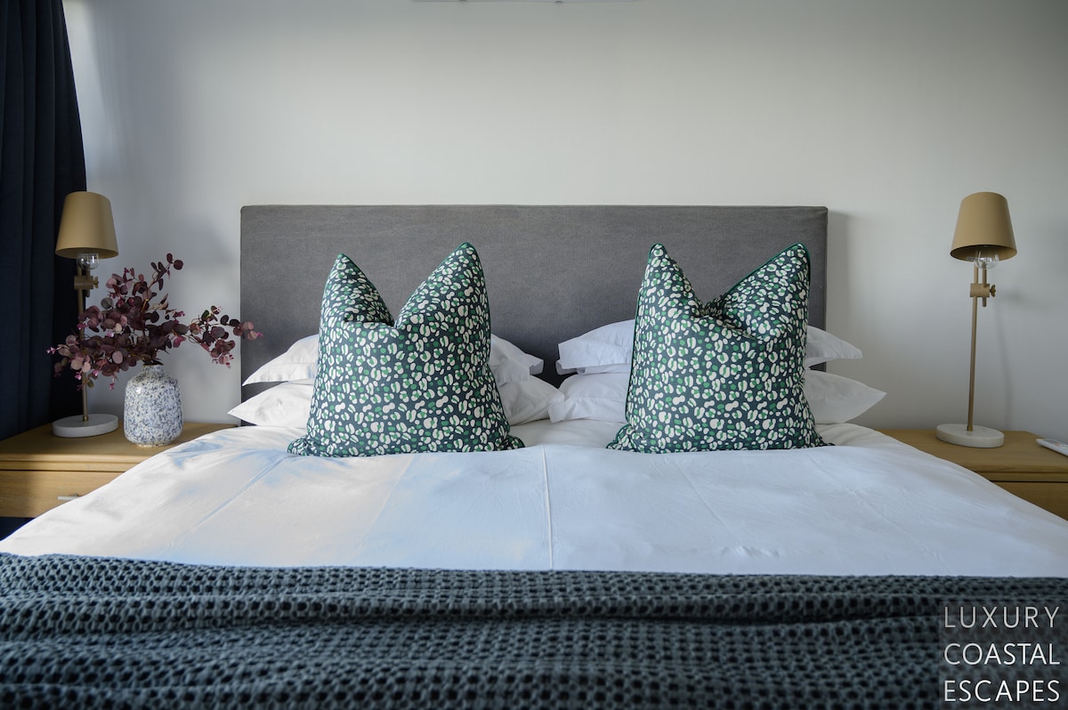 Bedroom One Downstairs Adult Room: King Size Bed with air-con, sea view and access to a balcony, block out curtains, built in cupboards, en-suite with bath tub, shower, open plan toilet and double basin.