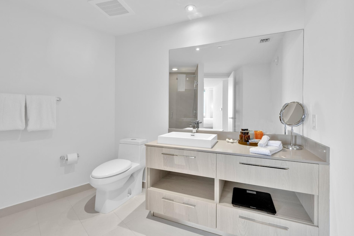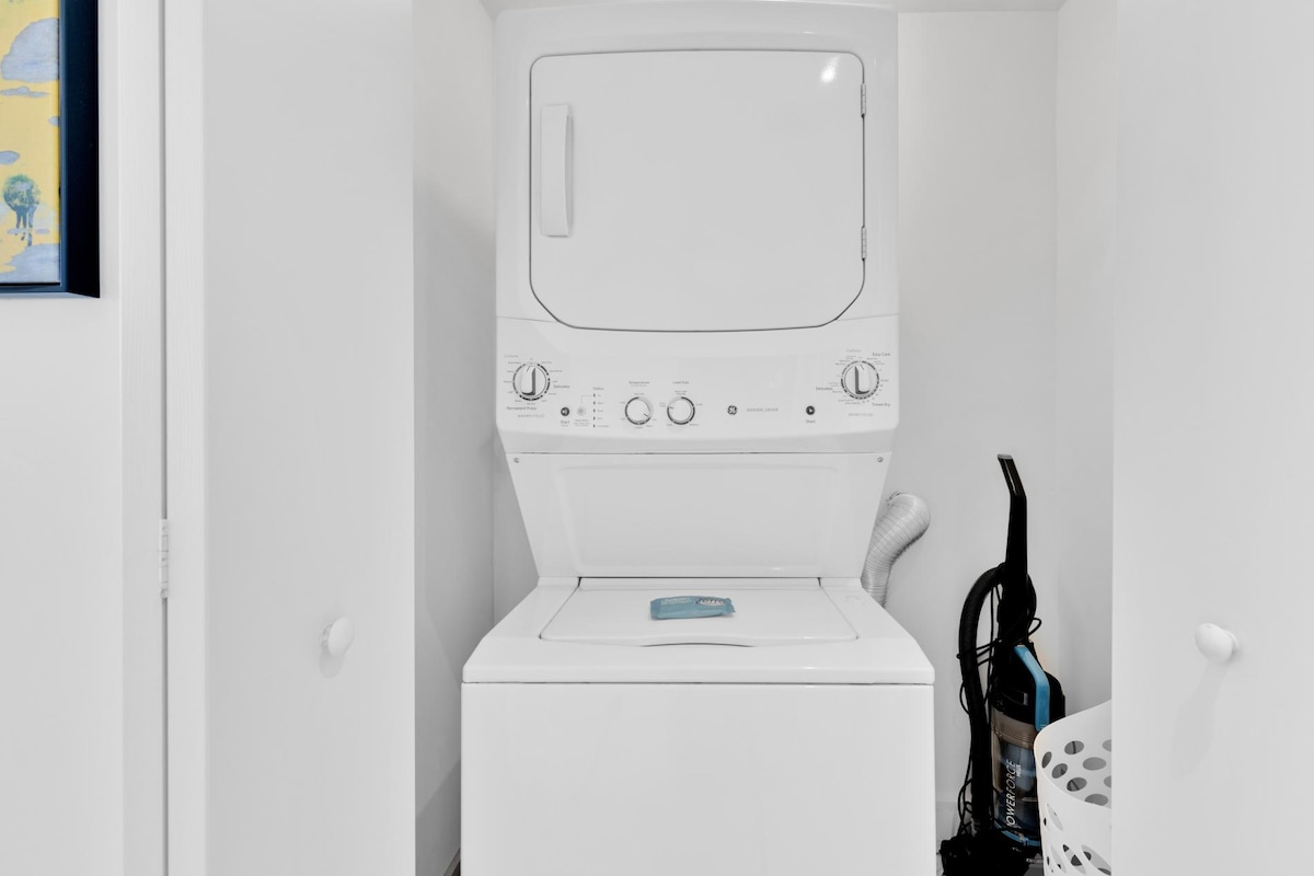 Master bedroom with a king-size bed and a private bathroom. The second bedroom has two full-size beds. The unit has another full bathroom with a glass shower box. Fully equipped kitchen integrated into the spacious living and dining room area. The living room has a sofa bed that can accommodate two guests. A washer and Dryer are
