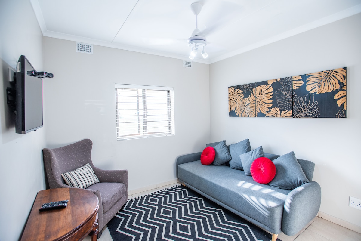 This flatlet sits at the back of the house. It has an open-plan kitchen & lounge area and a sleeper couch with a DSTV decoder. The kitchen has a fridge freezer, Two-plate electric stove, kettle, toaster, microwave and coffee plunger.