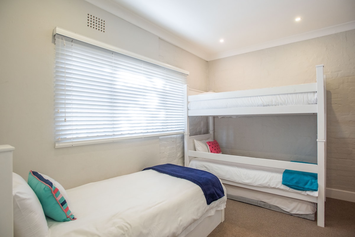 Bedroom Four (kids room): Bunk bed plus single bed with pull-out mattress, standing fan, plantation shutters, built in open shelving for clothes with a hook and hangers, en-suite with single basin, shower & loo