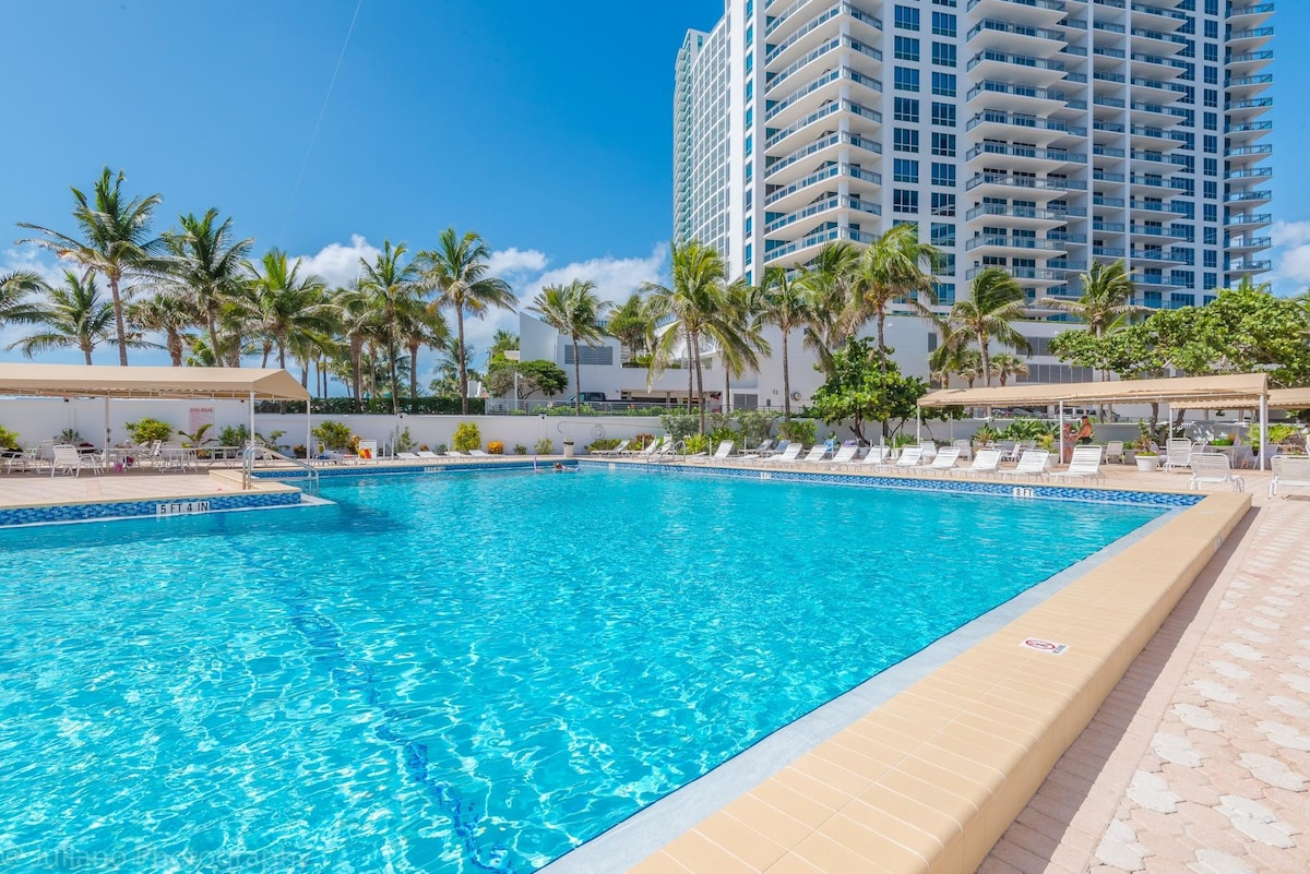 The building offers resort-style amenities with an oceanfront pool and gym.