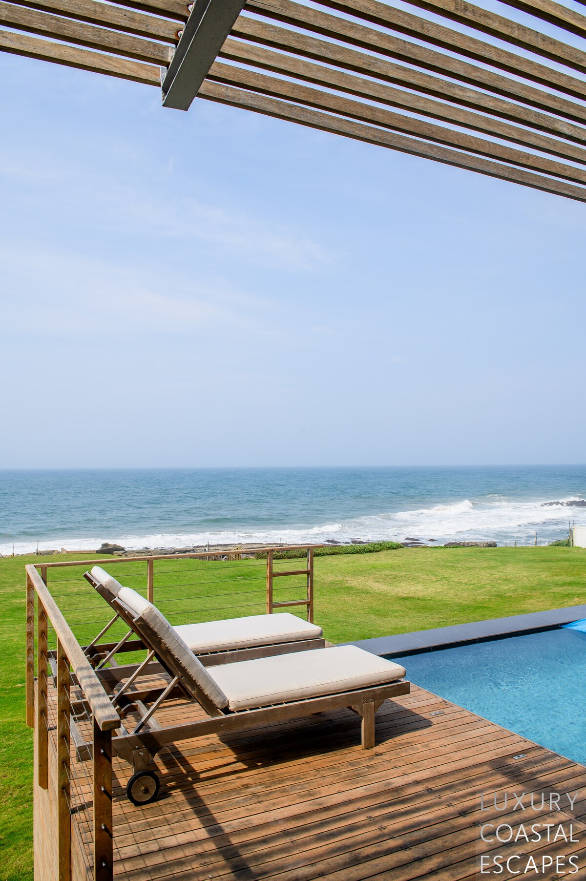 The entertaining space is all open plan with a large state of the art kitchen, separate scullery, two dining areas, lounge and TV area. All this entertaining space flows out on to a wooden deck with a rim-flow pool, braai area, further soft seating and dining