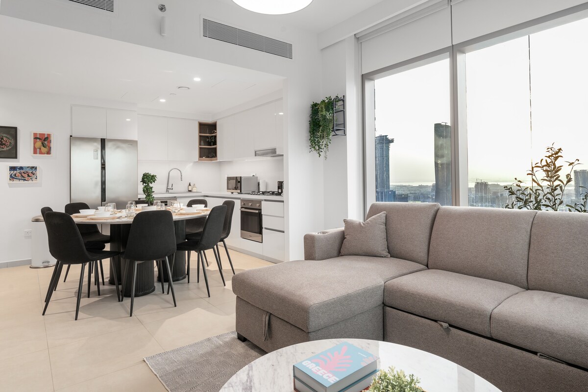 Imagine yourself in a sanctuary of modern sophistication, where floor-to-ceiling windows present stunning cityscape views. The open-plan layout seamlessly combines style and functionality, featuring two tranquil bedrooms, each with a luxurious en-suite bathroom. The apartment includes a fully furnished open kitchen and a dedicated laundry area complete with a washer and dryer for added convenience. The expansive living room, adorned with elegant furnishings such as a plush sofa, Tv, and essential furniture, extends to a balcony that overlooks the Skyline View over Za'abeel.Take advantage of the building's luxurious amenities, which include a spacious pool, a state-of-the-art gym, a large pool and sun loungers, a leisure deck, two children's play areas, a multifunction room, a BBQ area, and a versatile multi-purpose court, ensuring a truly opulent stay.