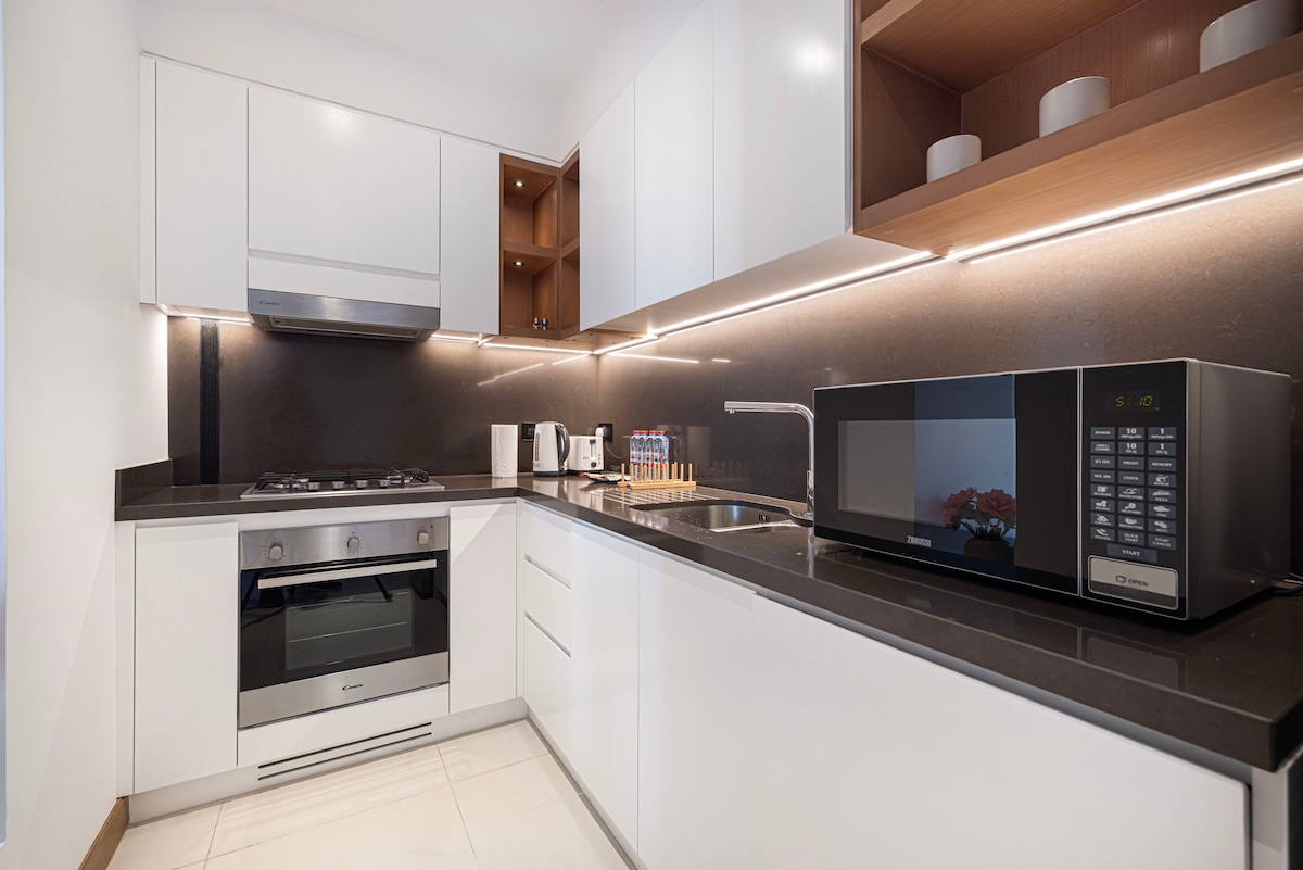 Relax in spacious bedrooms, enjoy a fully equipped kitchen, and unwind with floor-to-ceiling windows showcasing the city lights.