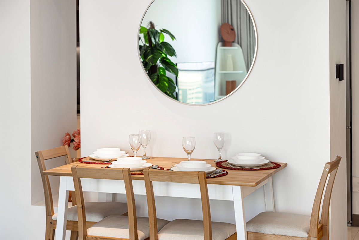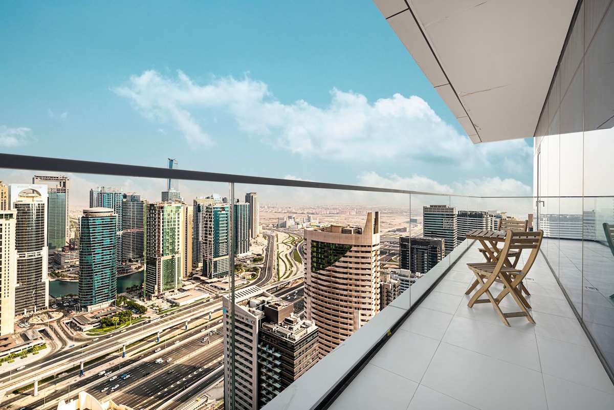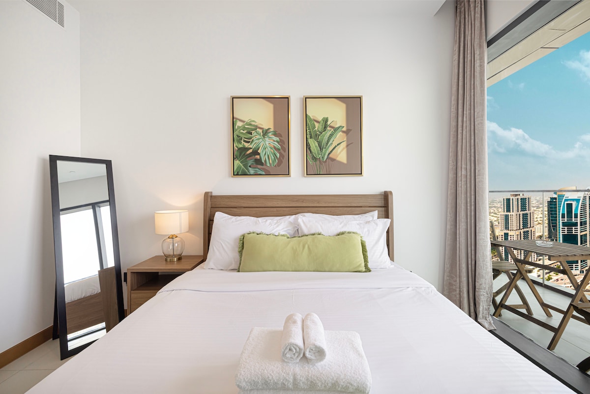 Perfect for couples, families, or business travelers, the apartment is fully furnished with modern decor, an open living area, and a private balcony to enjoy the skyline.