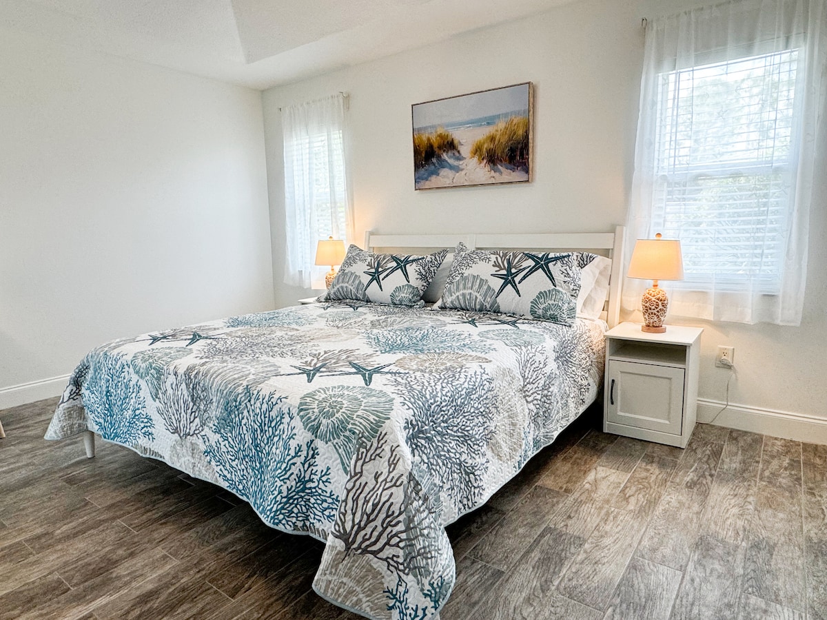 Step inside to find a thoughtfully furnished interior with a coastal flair. The home features an open living and dining area, ideal for relaxing with family or friends after a day at the beach. The fully equipped kitchen has everything you need to cook meals at home, including modern appliances, cookware, and plenty of counter space.
