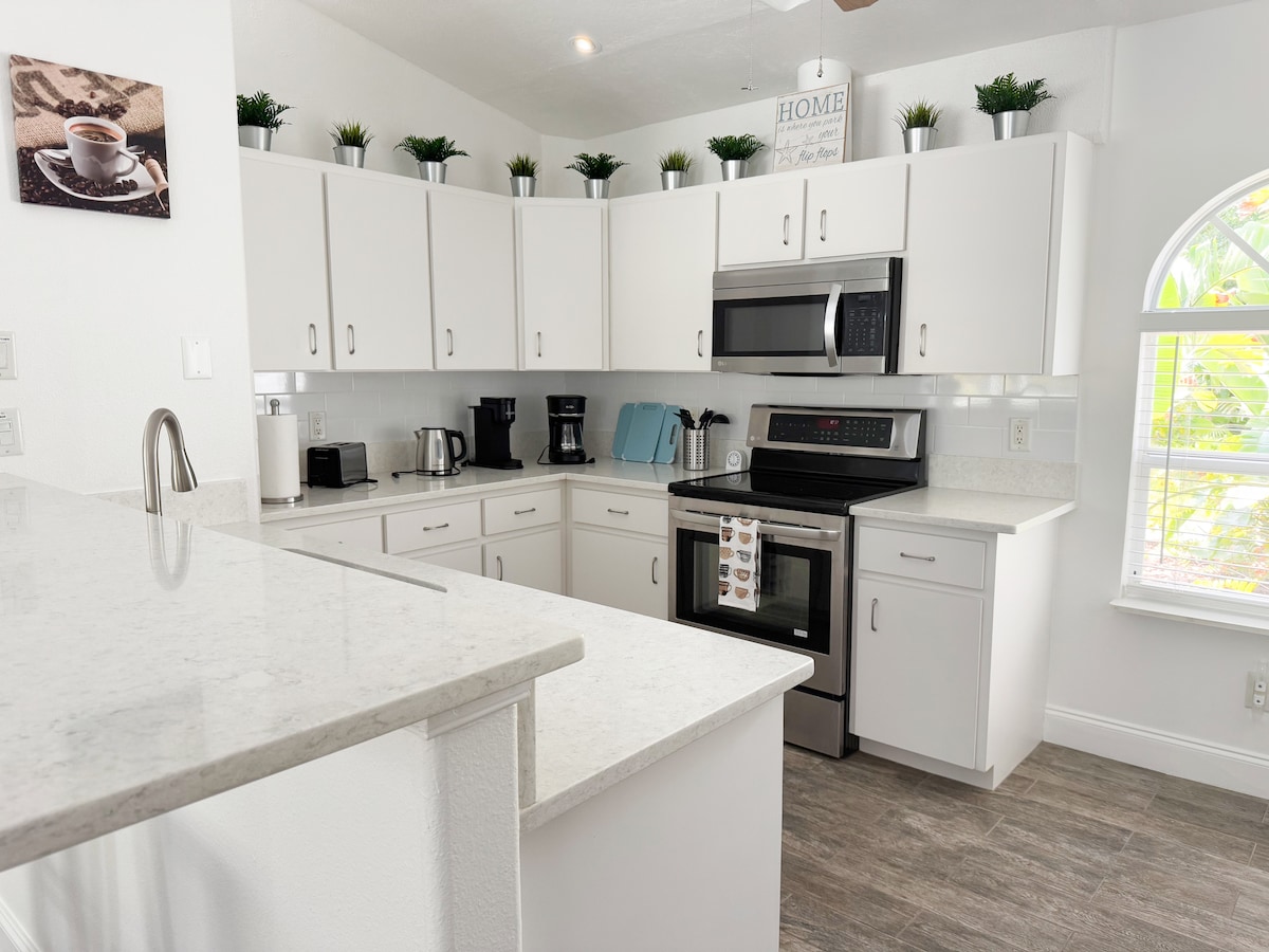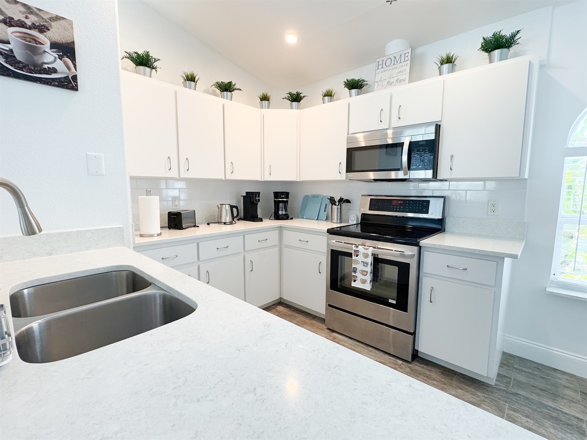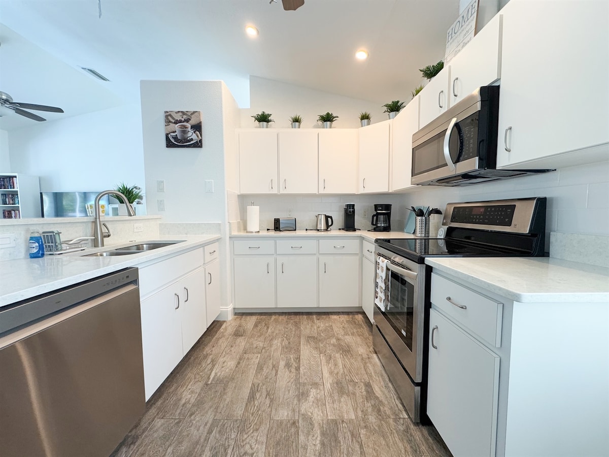 Enjoy the fully equipped kitchen, open living space, and peaceful neighborhood.