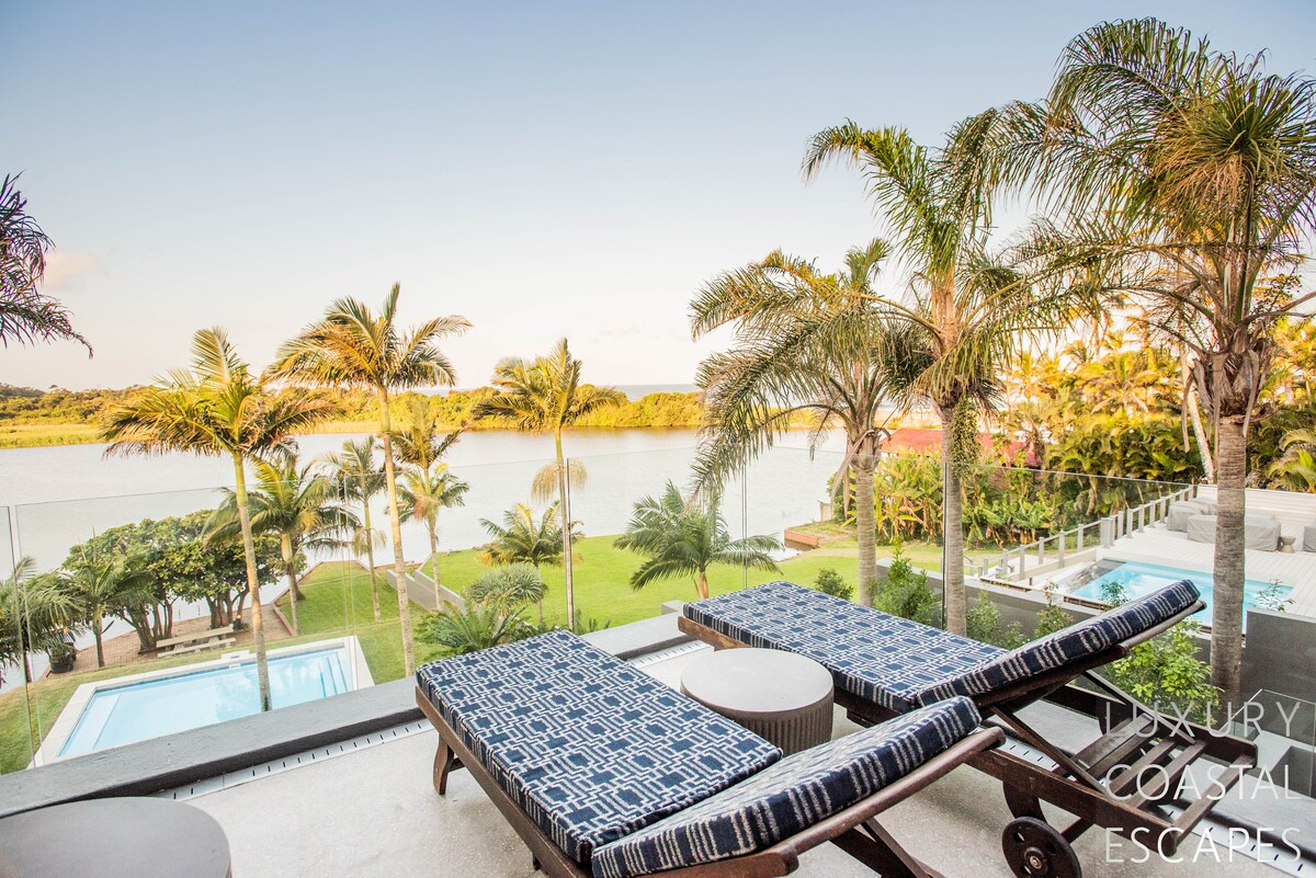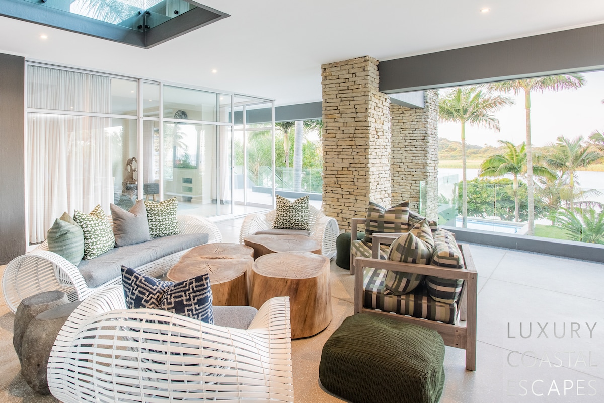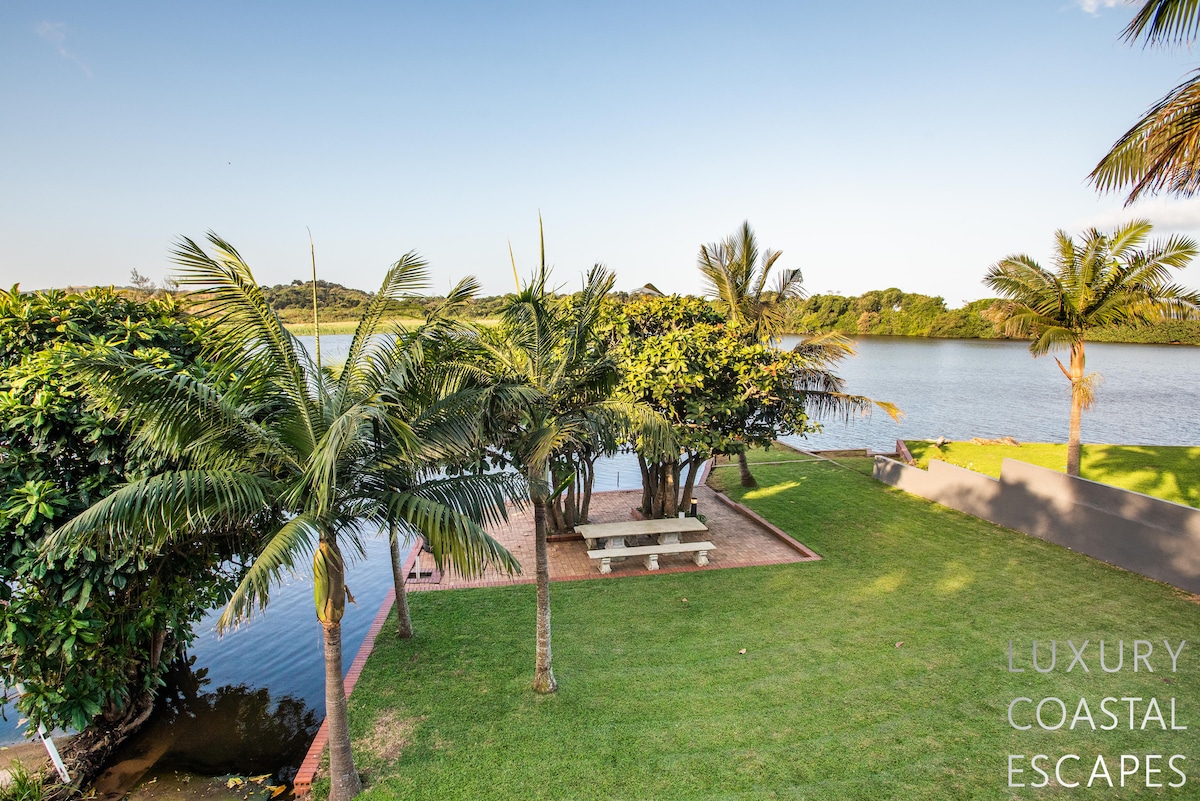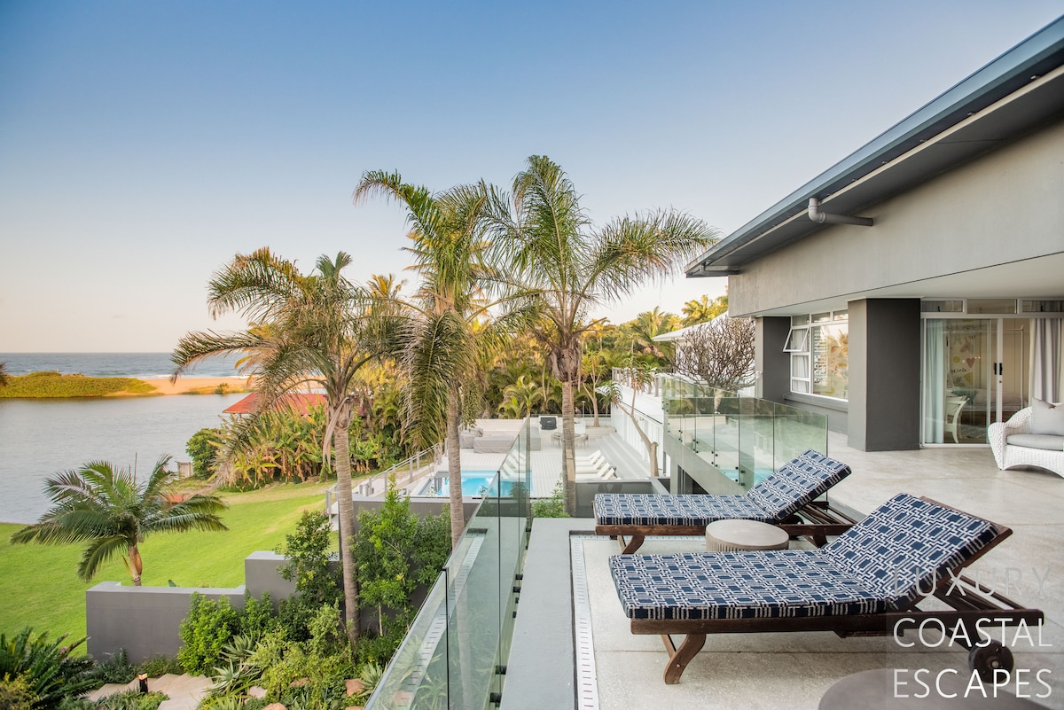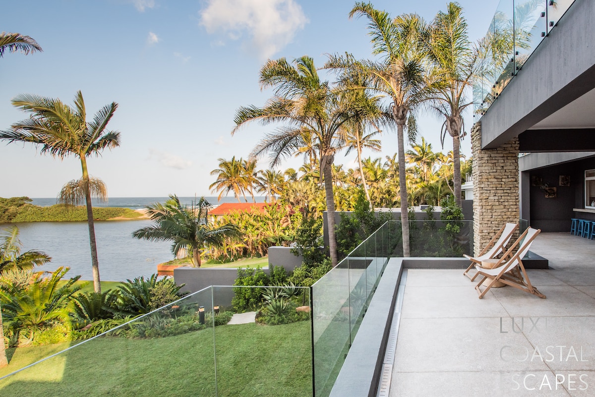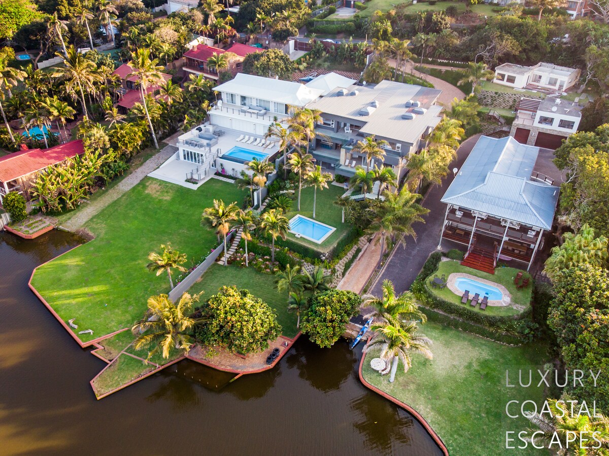 Can accommodate 16 people (max 8 adults). This incredible 6 bedroom beach house offers space, privacy and incredible views across the lagoon and onto the ocean. The house sits on the lagoon in Zinkwazi with perfectly manicured lawns, a pool area and a private lagoon frontage with boat mooring. The house sits over 3 levels with 4 bedrooms on the top floor, entertaining space spanning the middle level and a self-contained flatlet being on the ground and pool level.