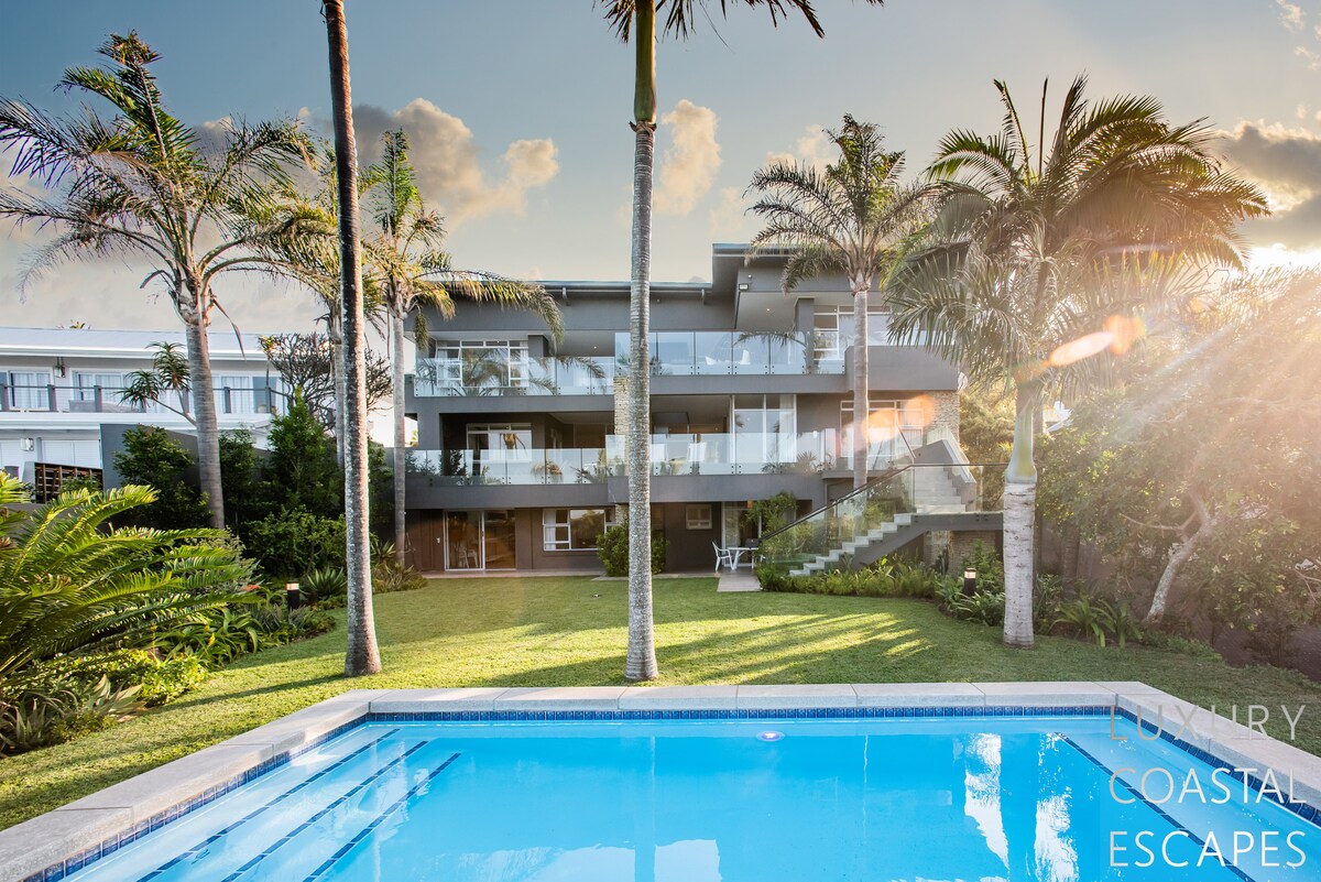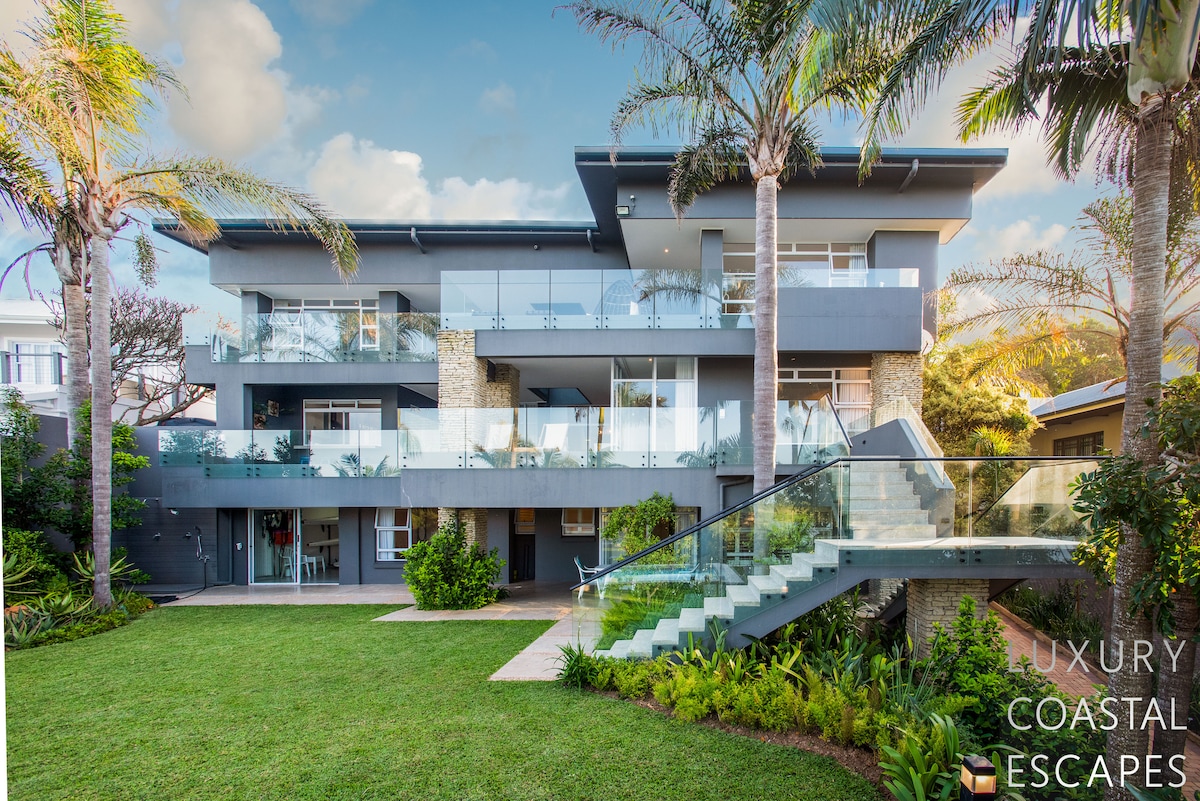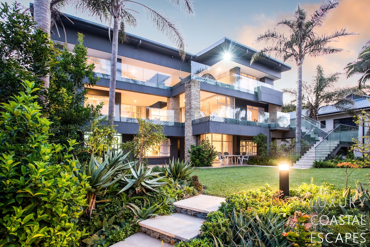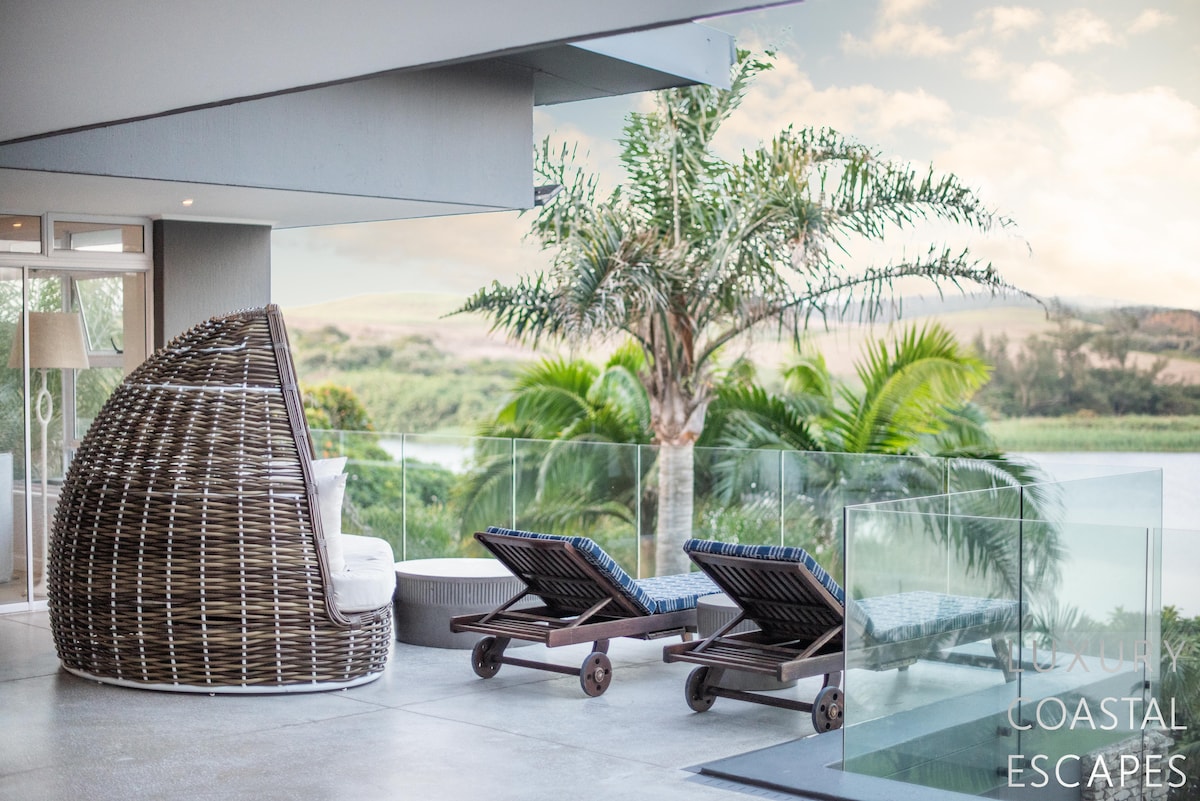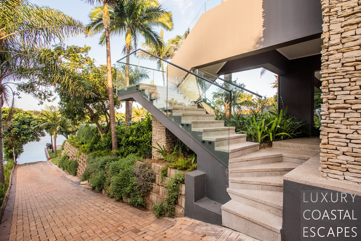 Can accommodate 16 people (max 8 adults). This incredible 6 bedroom beach house offers space, privacy and incredible views across the lagoon and onto the ocean. The house sits on the lagoon in Zinkwazi with perfectly manicured lawns, a pool area and a private lagoon frontage with boat mooring. The house sits over 3 levels with 4 bedrooms on the top floor, entertaining space spanning the middle level and a self-contained flatlet being on the ground and pool level.