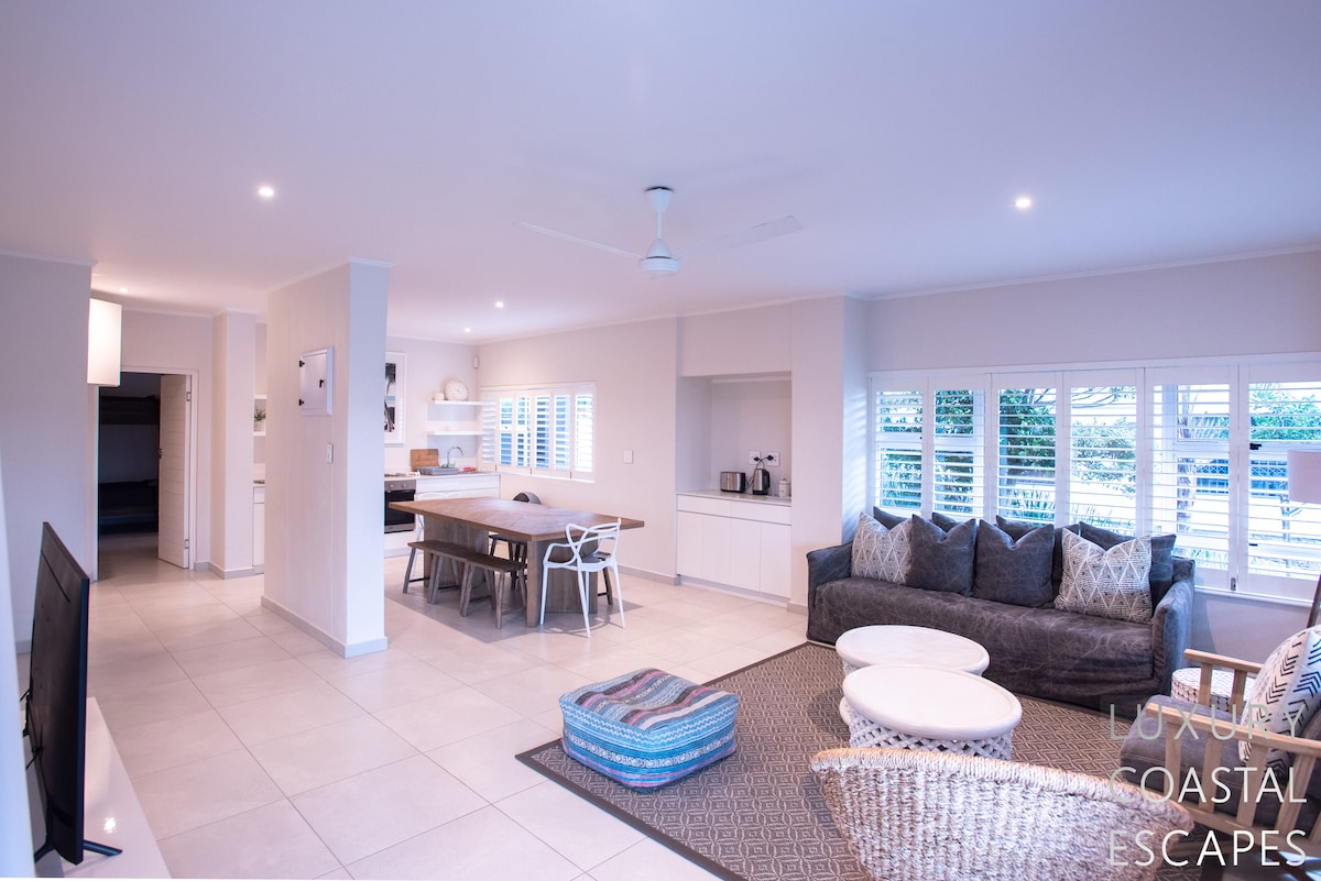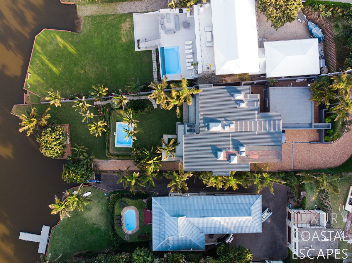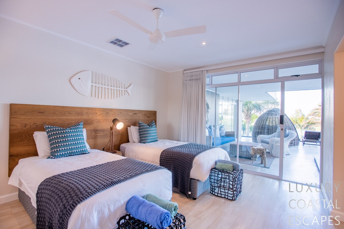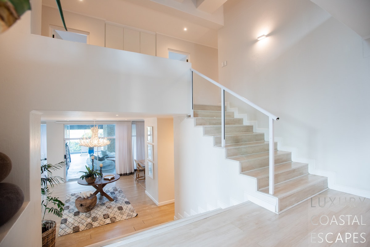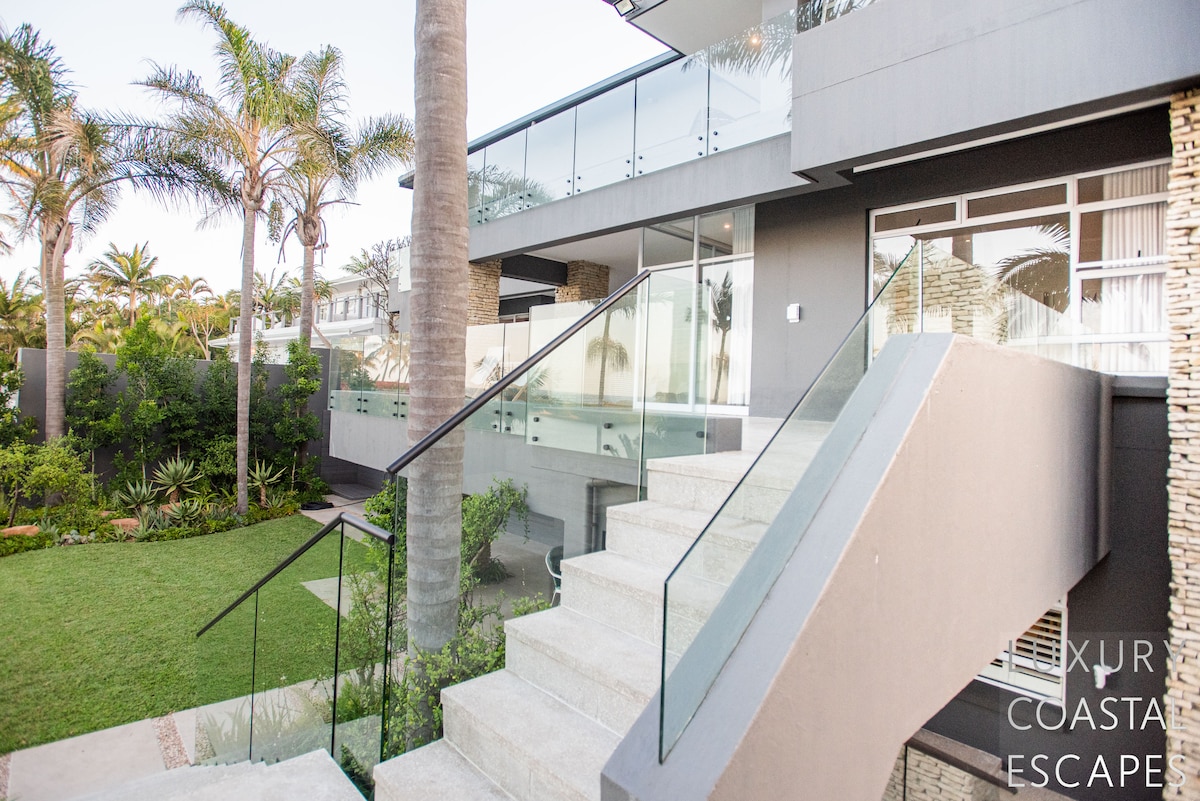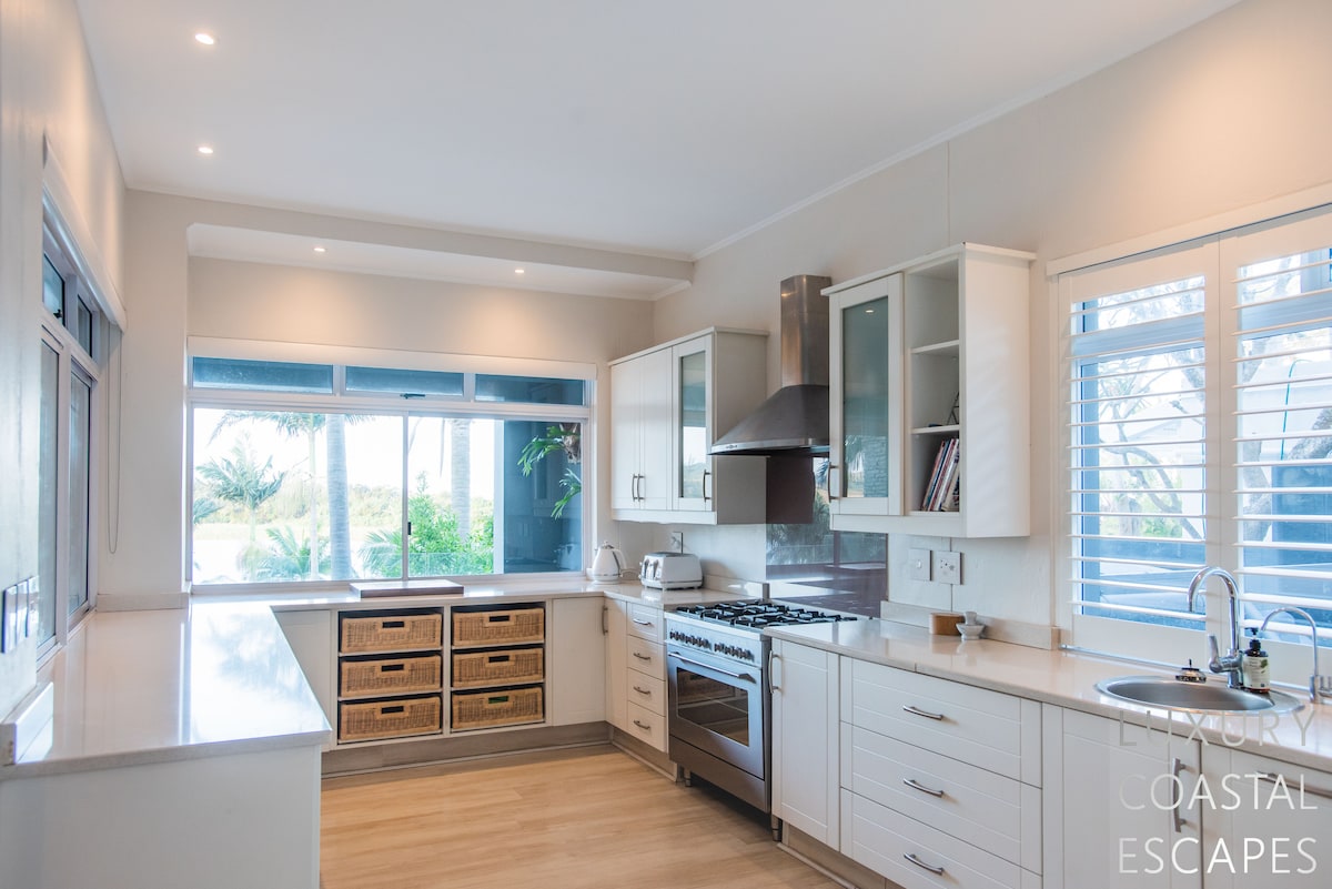 Can accommodate 16 people (max 8 adults). This incredible 6 bedroom beach house offers space, privacy and incredible views across the lagoon and onto the ocean. The house sits on the lagoon in Zinkwazi with perfectly manicured lawns, a pool area and a private lagoon frontage with boat mooring. The house sits over 3 levels with 4 bedrooms on the top floor, entertaining space spanning the middle level and a self-contained flatlet being on the ground and pool level.