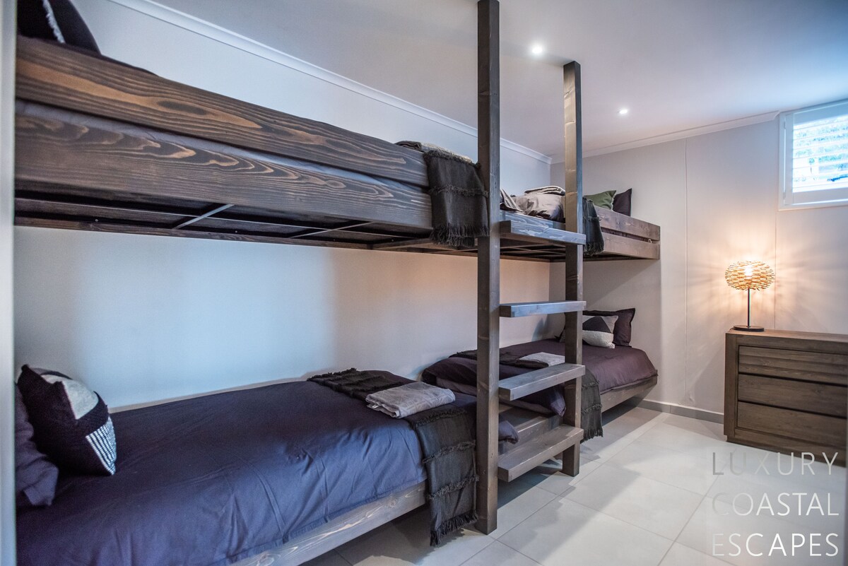 Bedroom Five (self-contained flatlet - ground level): The kid's bunk room has 3 double bunk beds, air-con, ceiling fan, built-in wardrobes and an en-suite bathroom with shower, separate loo and basin. The bedroom has a ping pong table area for kids