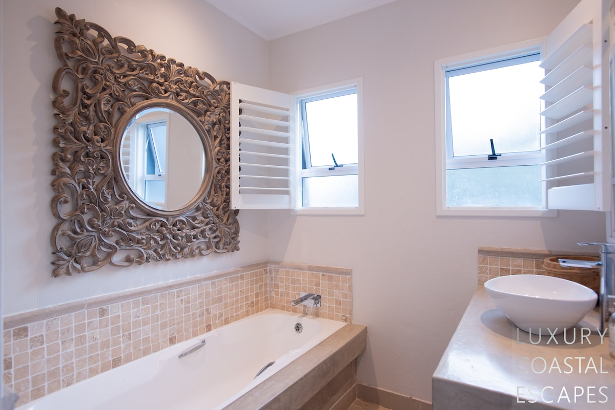 Bedroom Six (self-contained flatlet - ground level): Queen bed, air-con, ceiling fan, lagoon views, built-in wardrobes and en-suite with bath, shower, separate loo and basin.