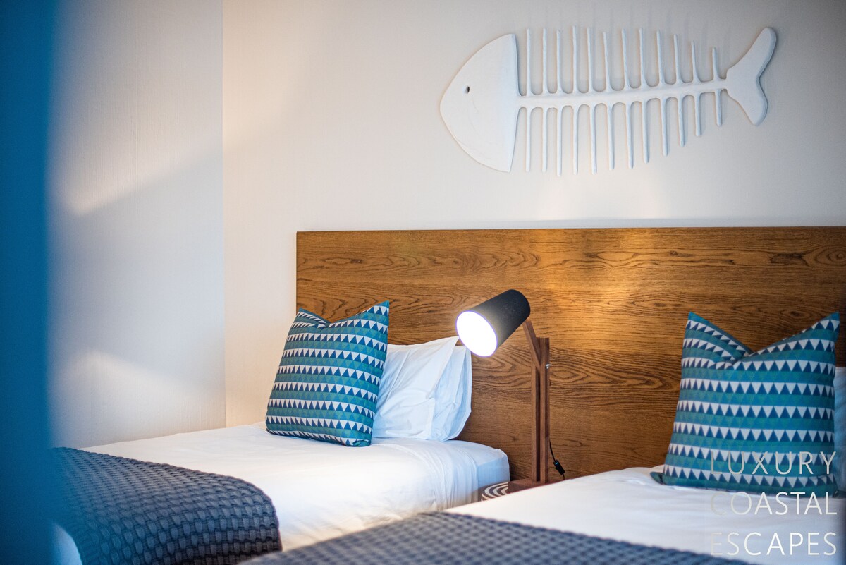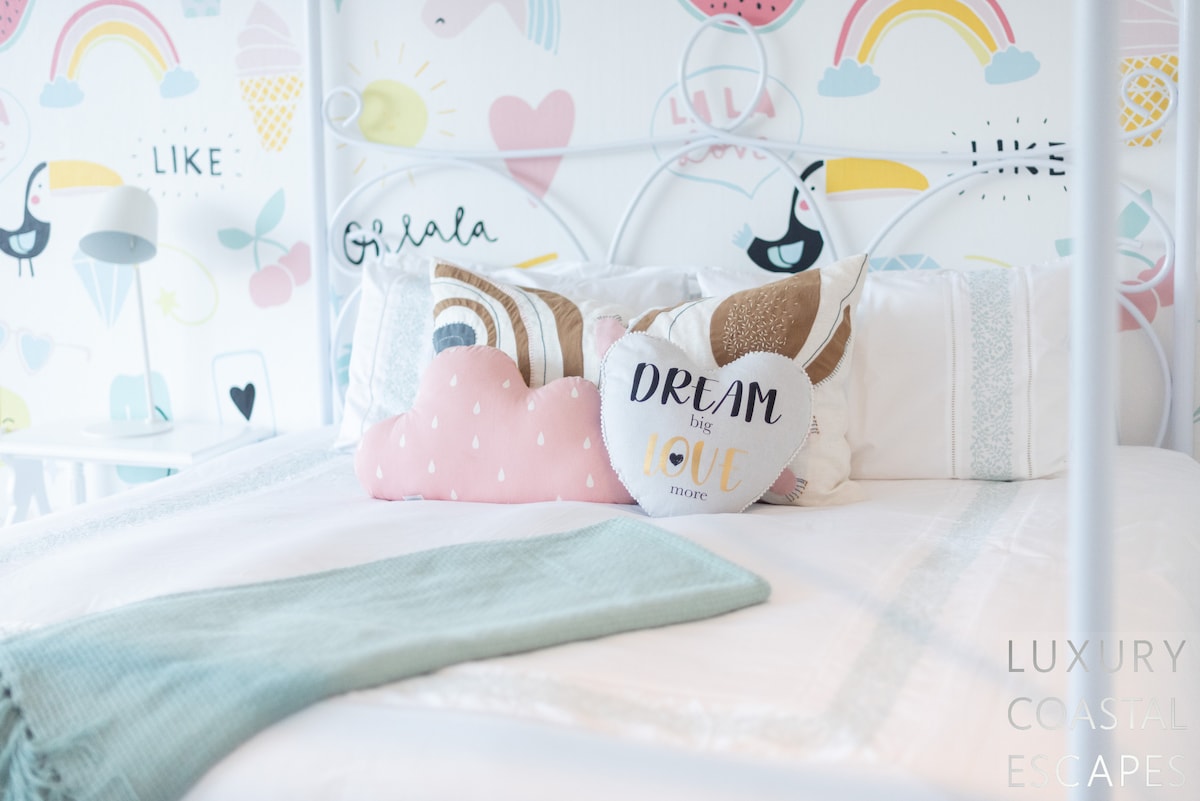 Bedroom Two (top floor): Kids room with two 3/quarter beds, sea & lagoon views, ducted air-con, ceiling fan and access onto the top verandah. There are built-in wardrobes and shared use of the family bathroom over the hallway with a separate loo, separate shower and separate bath & basin.