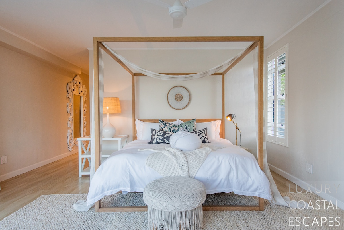 Bedroom Four (top floor): Adult’s room with four-poster king-size bed, ducted air-con, ceiling fan, built-in wardrobes and access onto the top verandah. There is an en-suite with shower, sea & lagoon views and stacking doors onto the deck
