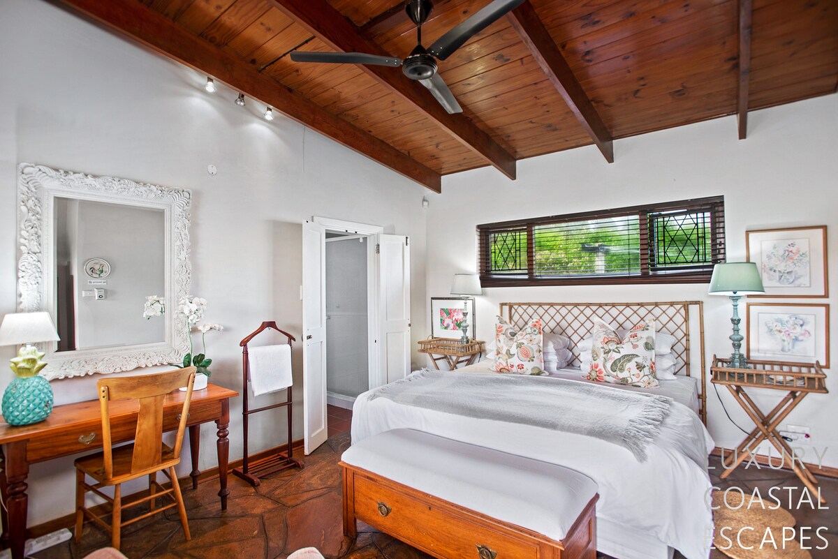 The house is set over one level with 3 of the 4 bedrooms being on an outside wing of the house which opens onto an undercover courtyard with small plunge pool & walled garden. The main house has 4th family bedroom, kitchen & open plan dining/living room with TV. The front undercover veranda offers further dining/soft seating with a garden & direct access onto Salt Rock main beach.