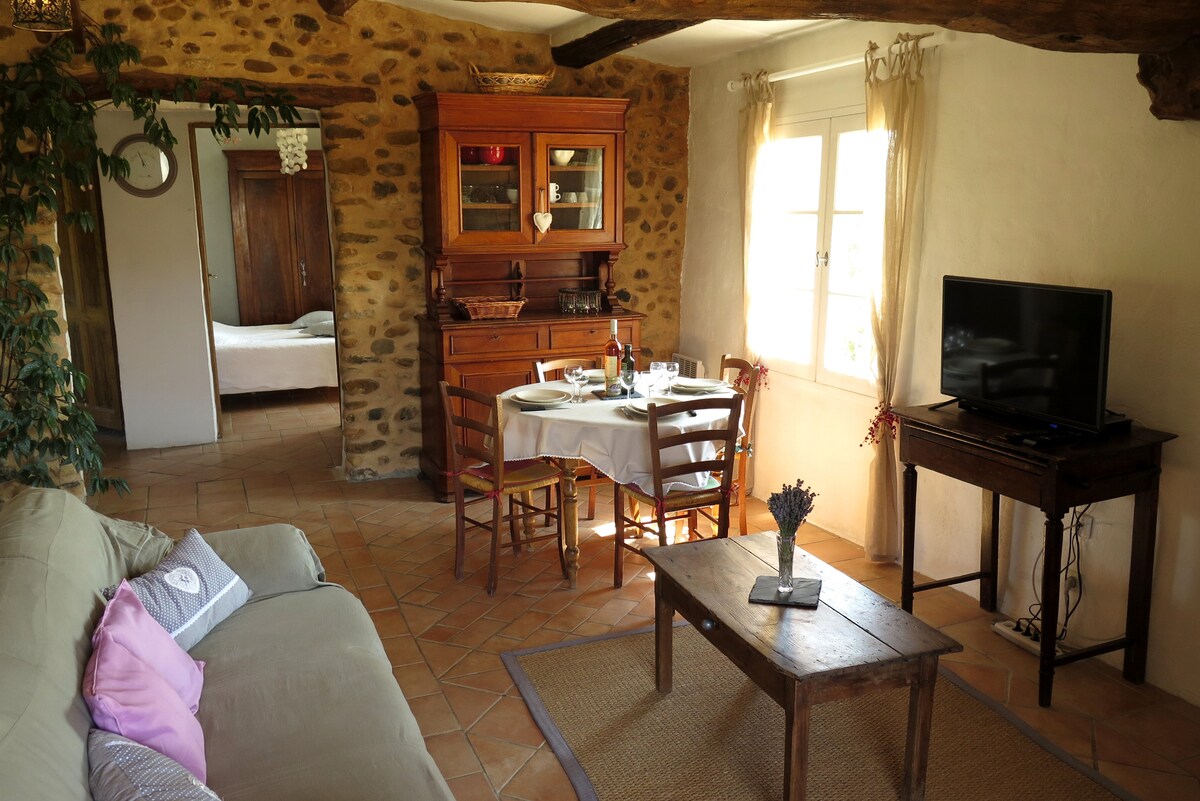- Living-dining room fitted out in the old hayloft with stove, television (wall with exposed pebbles).