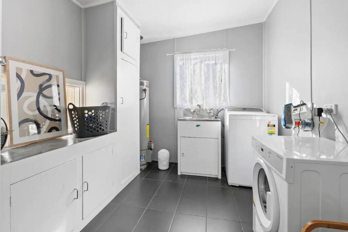 Each of the two bedrooms is thoughtfully presented and come with hotel-quality linens to ensure a good night’s sleep. The main has a queen-sized bed and gorgeous ornate fireplace, while the second comes with two single beds. A modern white bathroom boasts a spacious shower to help you feel refreshed, while a separate internal laundry adds to your everyday convenience with a washing machine and dryer.