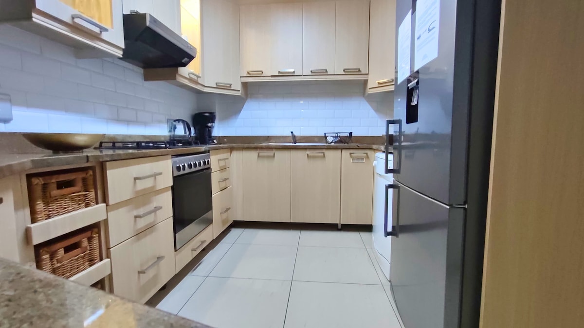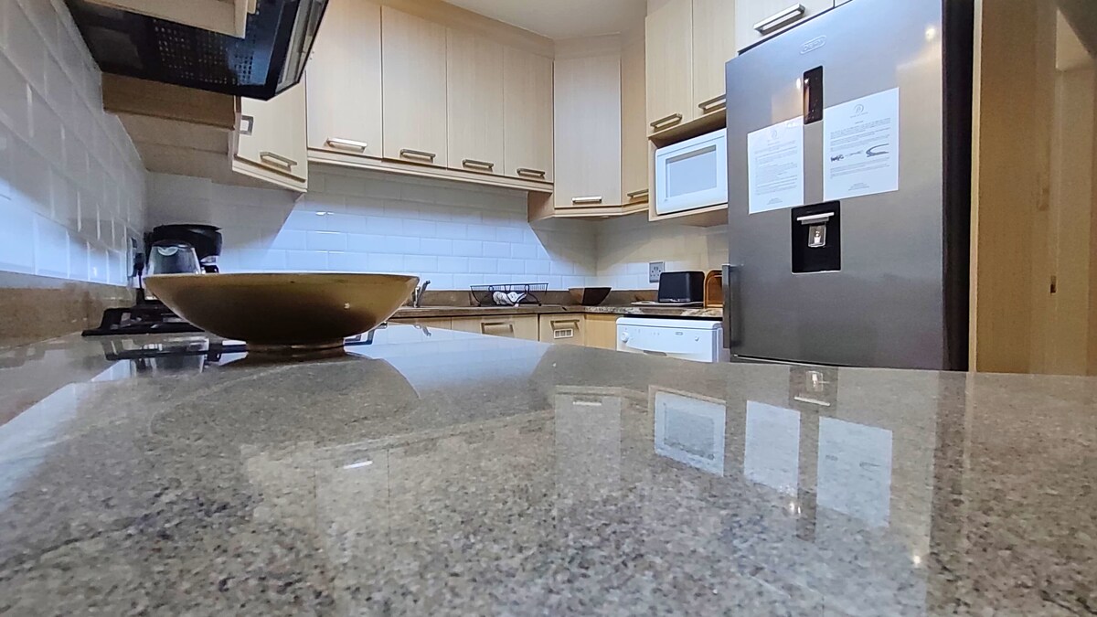 The apartment has a kitchen with a dishwasher, a microwave and a fridge,dining area, 3 bedrooms, and 2 bathrooms. There is a washing machine and tumble dryer in the garage for you to use.
