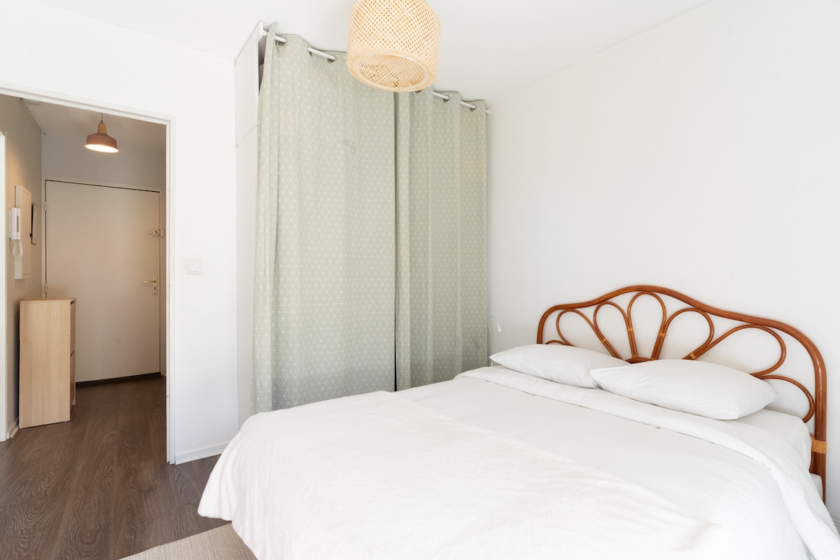 The bedroom is equipped with a 140x200 bed and a large storage closet for your belongings. You can enjoy a good night's sleep after a busy day.