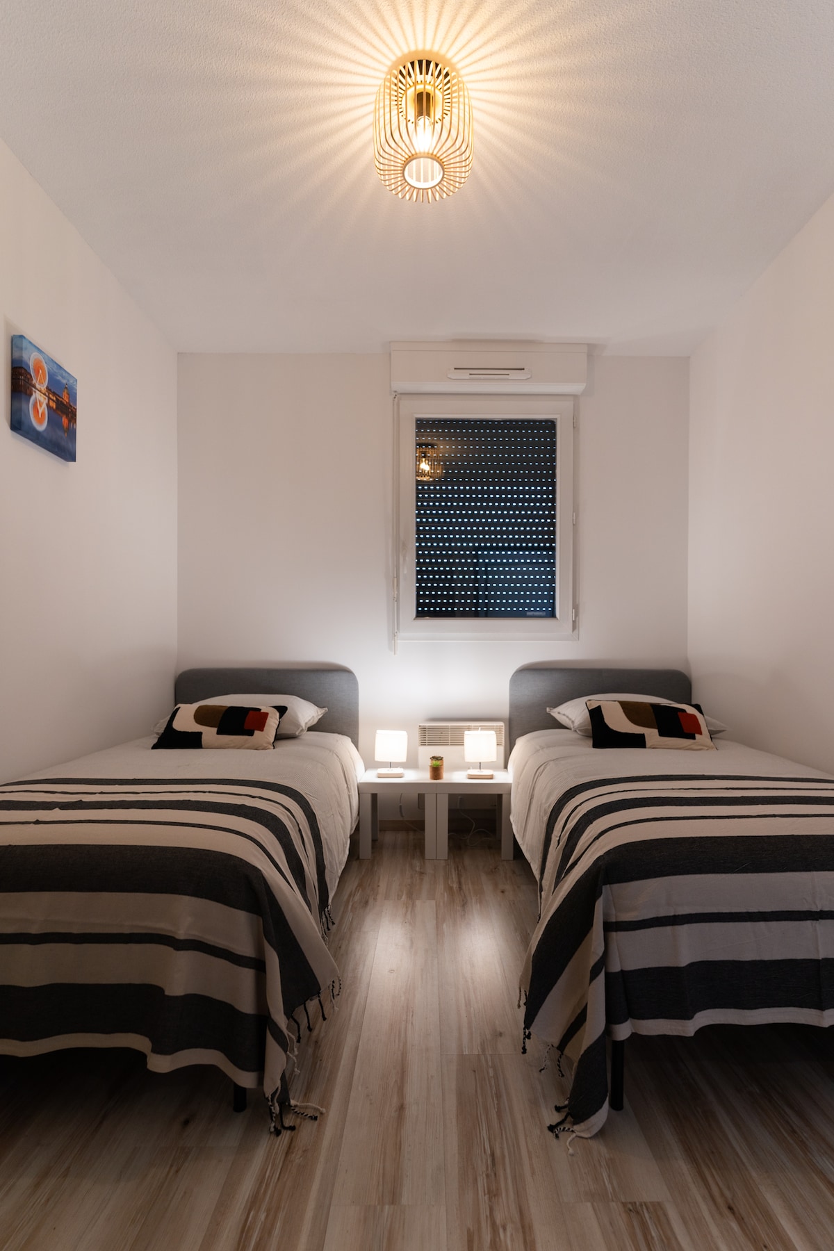 A door leads you to the sleeping area: a master bedroom, a real cocoon of softness, with a queen size bed for a good night's rest. A second bedroom, perfect for children or colleagues, offers two single beds promising comfort and privacy.