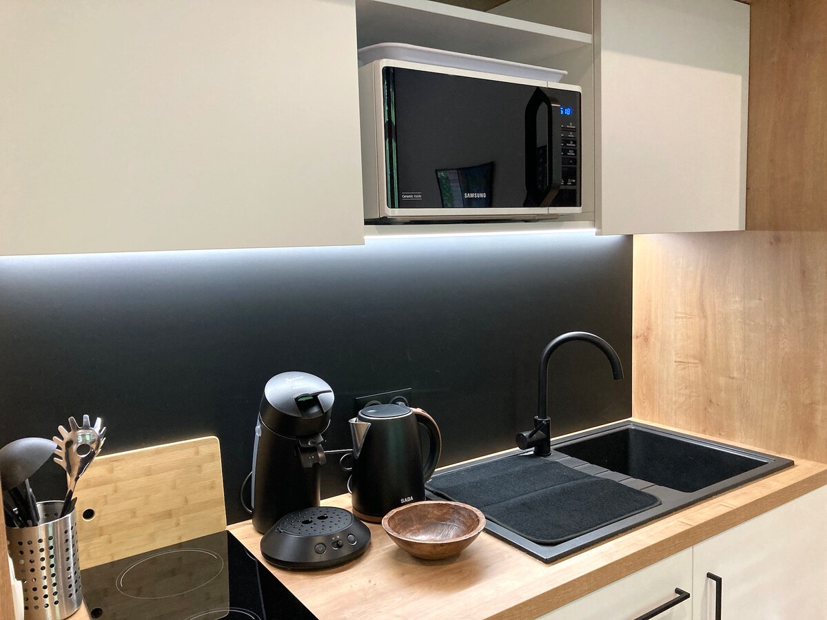 Modern amenities: The studio is equipped with all the amenities for a worry-free stay. A fast and reliable Wi-Fi connection will allow you to work with peace of mind, while the equipped kitchen will give you the freedom to prepare your meals as if you were at home.