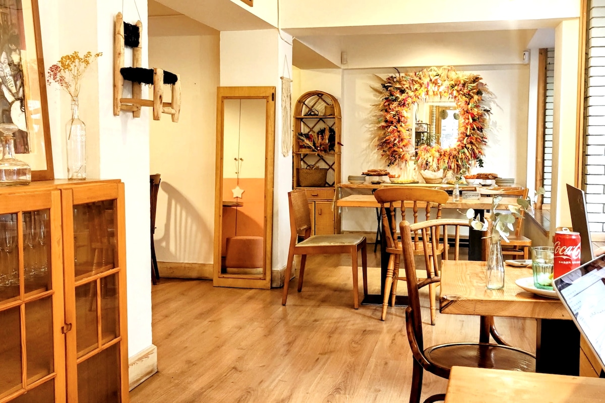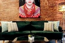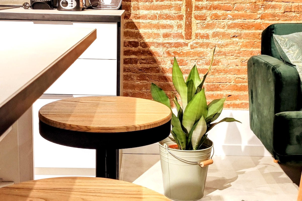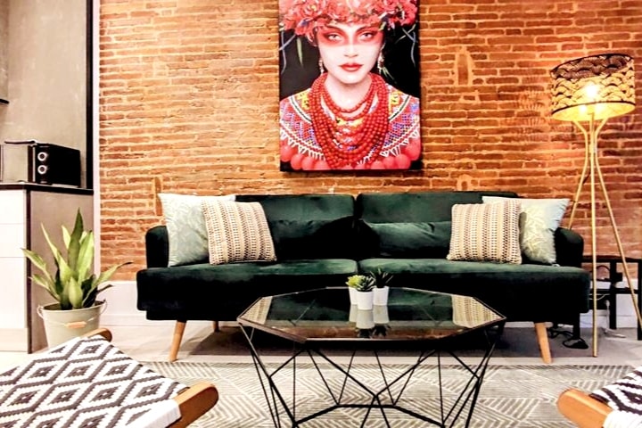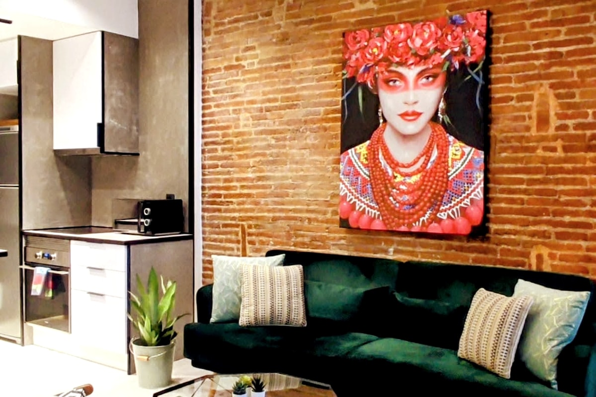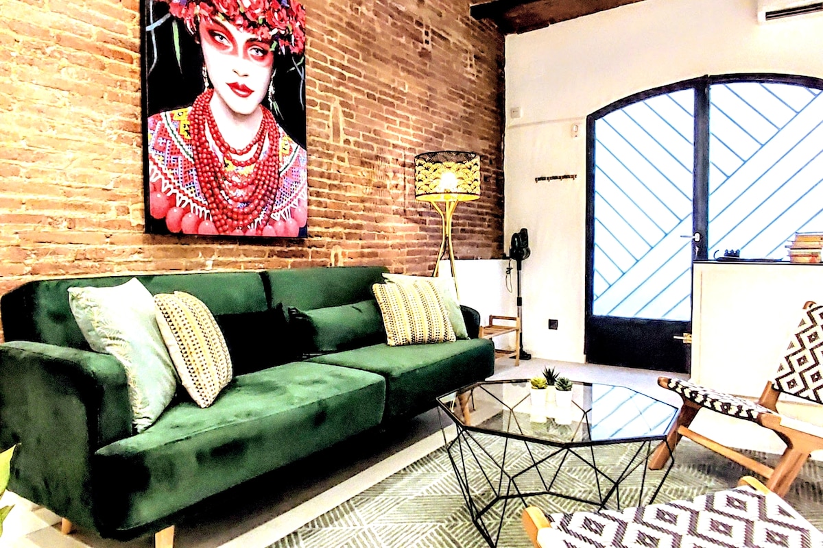 Discover Cocô in Sant Gervasi, featuring a 1-BR space with double bed and private bathroom. Proximity to the metro and FGC adds convenience, surrounded by a lively area with cafes, restaurants and shops. The New York style kitchen, green velvet sofa, exposed brick wall, and vaulted ceiling create an unique atmosphere. Perfect for immersing yourself in city life like a local, exploring neighbourhood shops, strolling, and conveniently storing your bike at home.