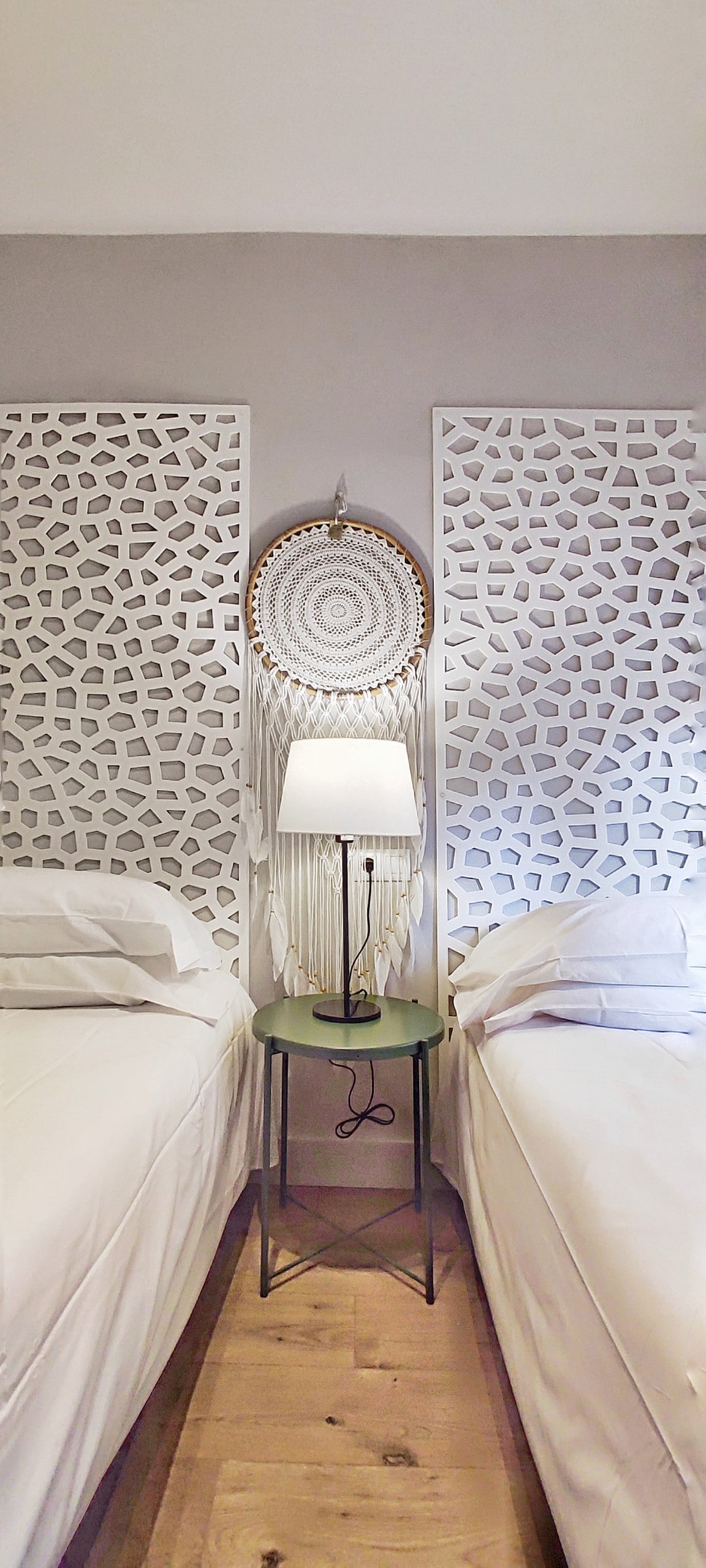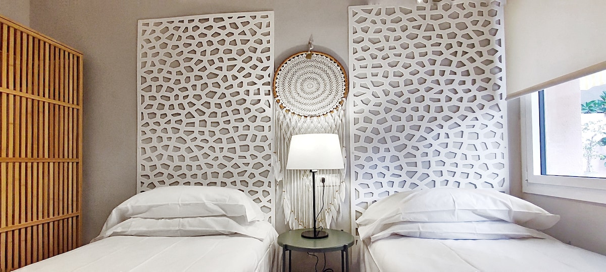 Third bedroom with a romantic touch featuring two single beds and a large wooden wardrobe.