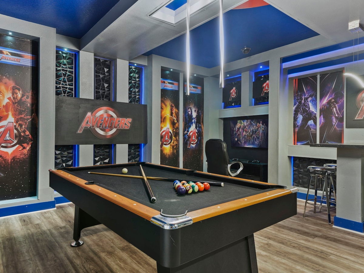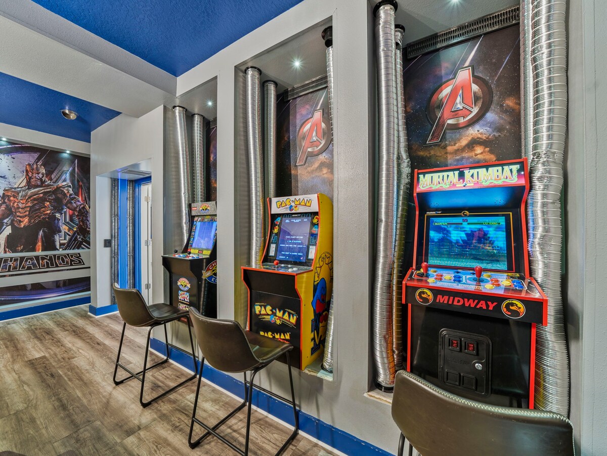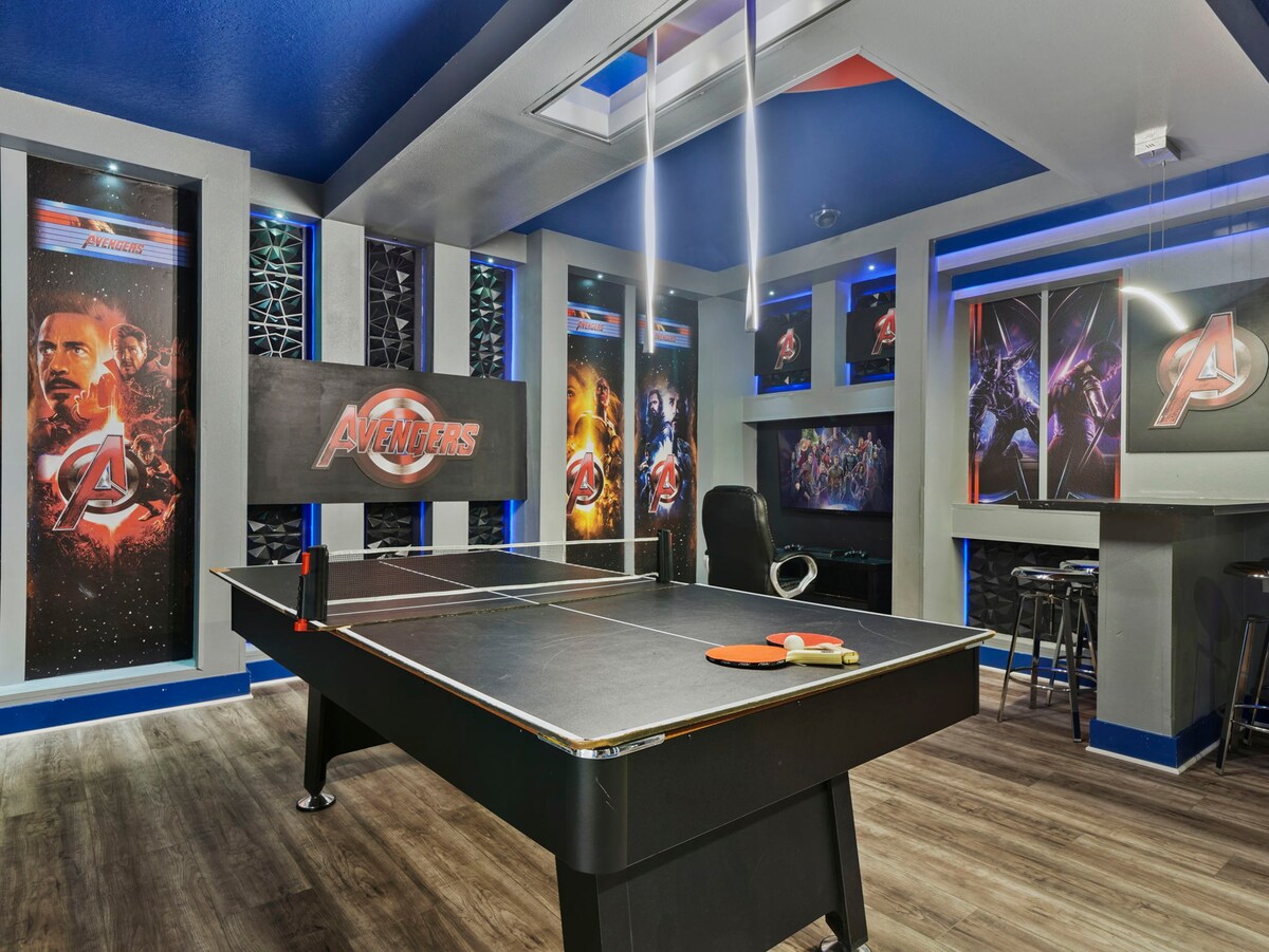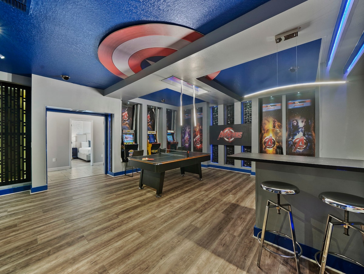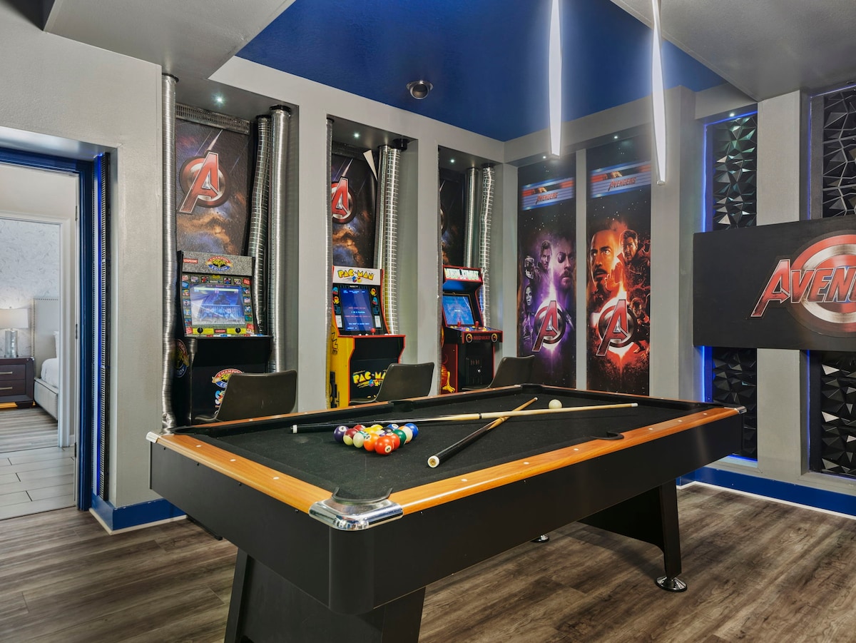 The fun never stops with a Marvel-themed game room equipped with a pool table, skeeball, and classic arcade games. The loft offers a cinema-like experience with a projection screen TV, perfect for movie nights after a day at the parks.