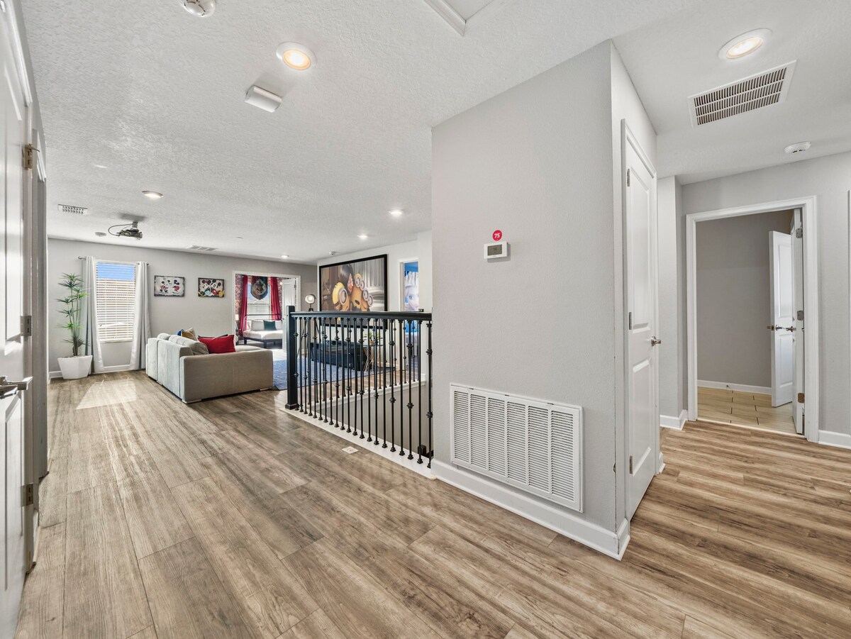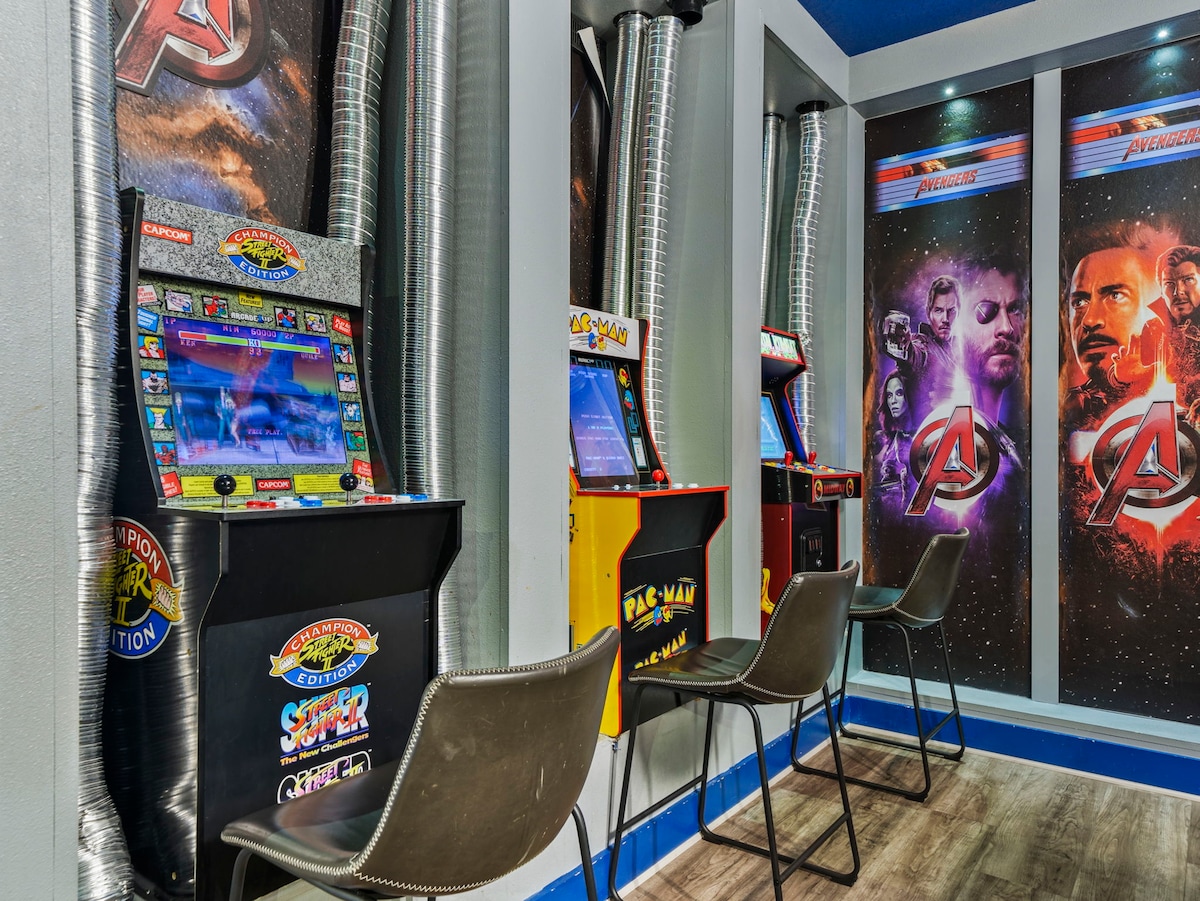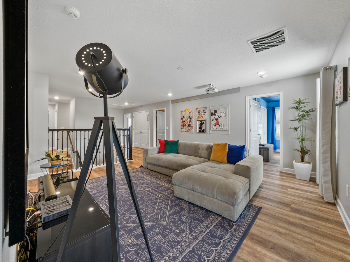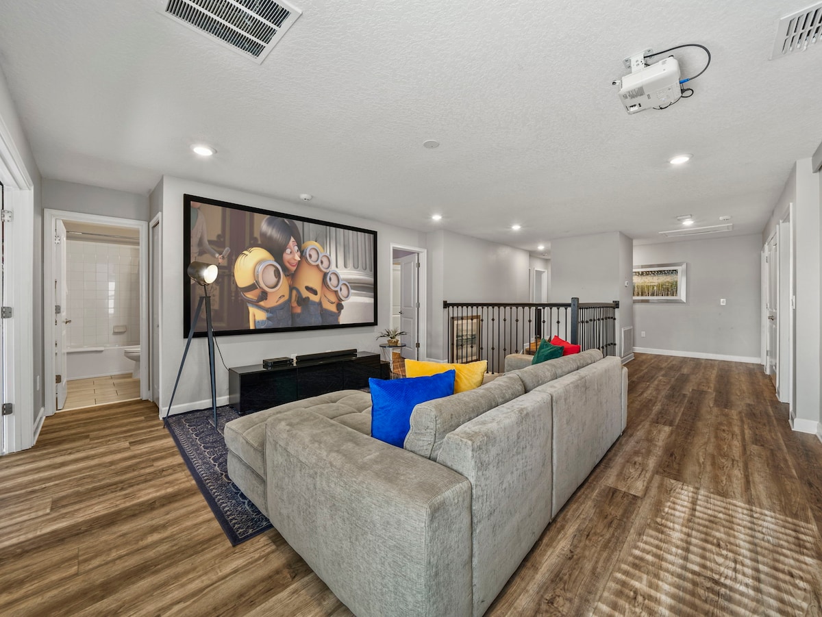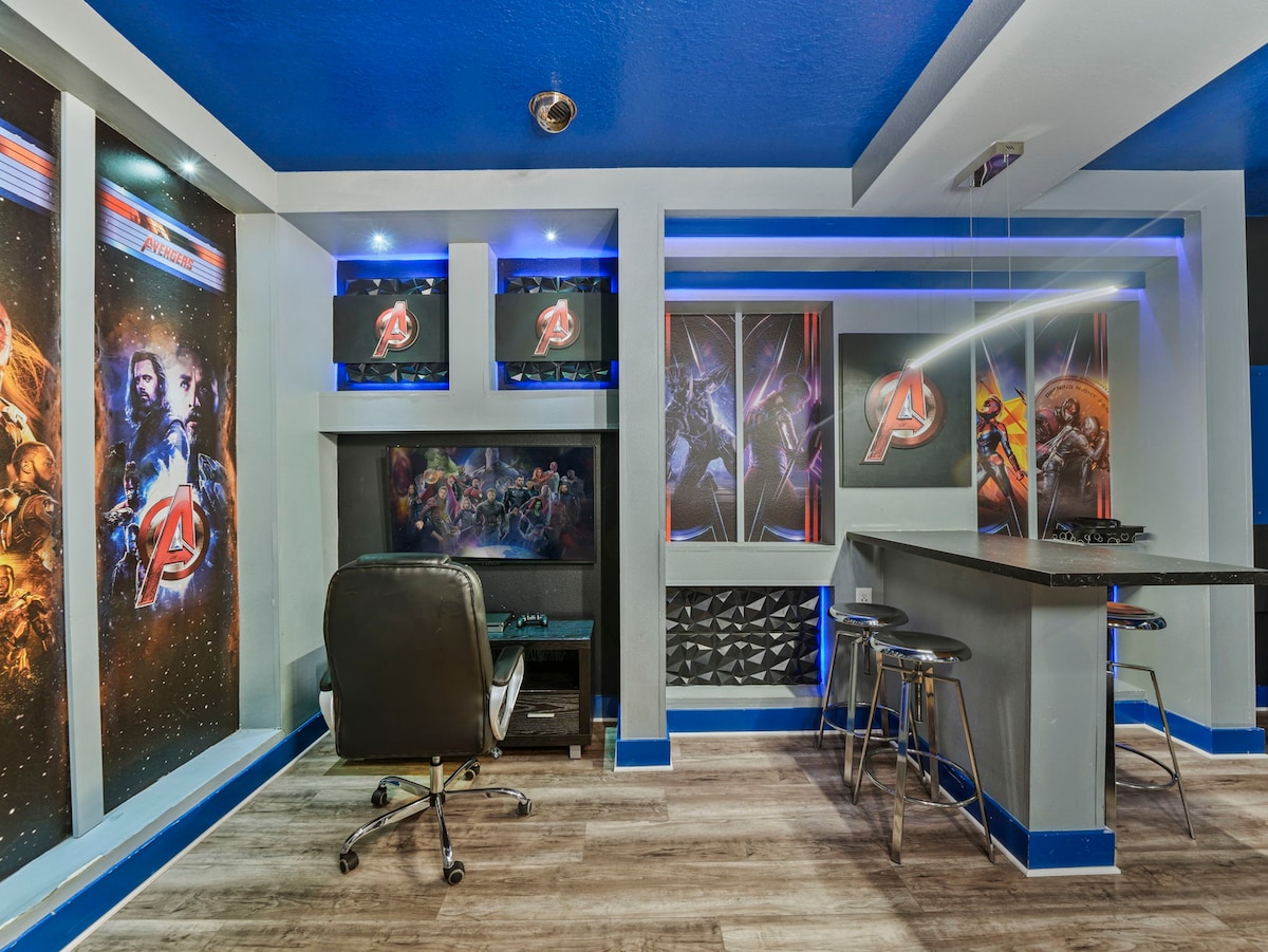 The fun never stops with a Marvel-themed game room equipped with a pool table, skeeball, and classic arcade games. The loft offers a cinema-like experience with a projection screen TV, perfect for movie nights after a day at the parks.