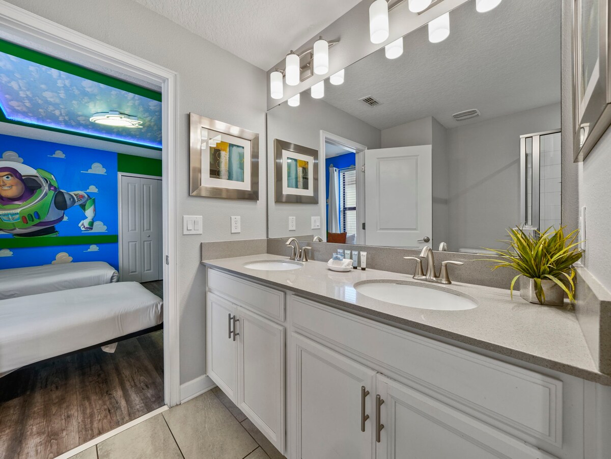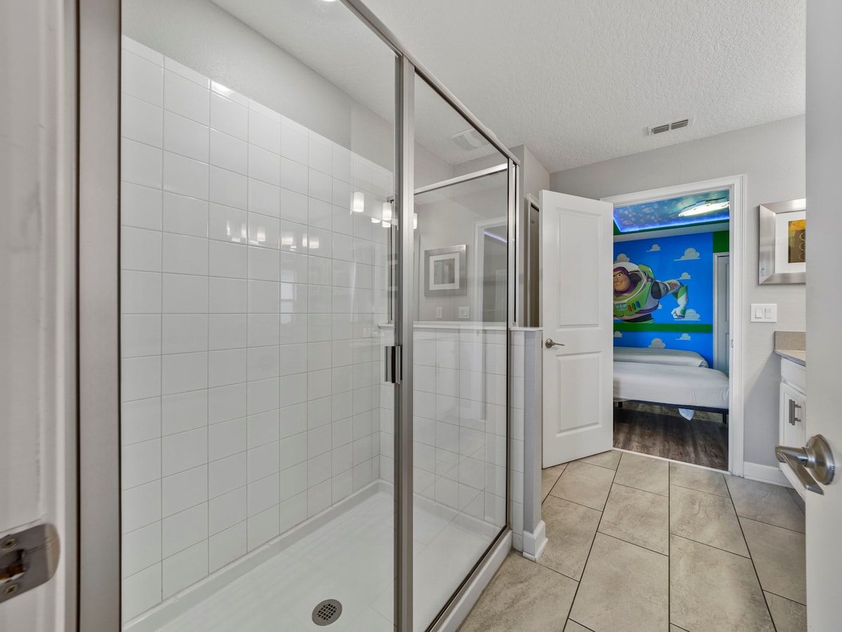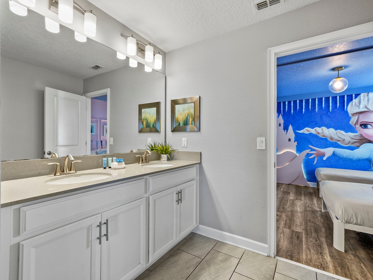 This home features nine uniquely themed bedrooms that add an extra touch of magic to your stay. Kids will adore the Mickey Mouse, Toy Story, Frozen, and Harry Potter-themed rooms, while adults can retreat to the sophisticated king and queen bedrooms, each designed with style and comfort in mind.