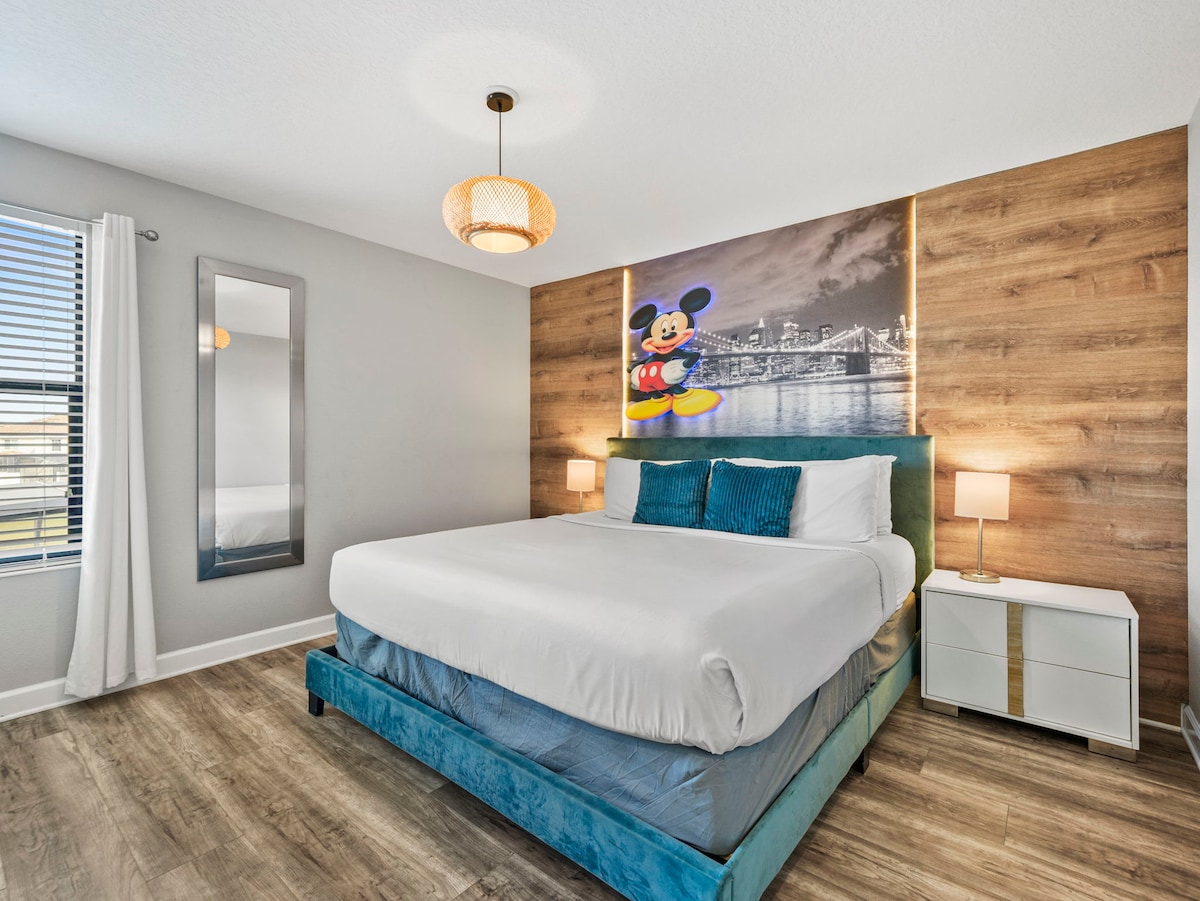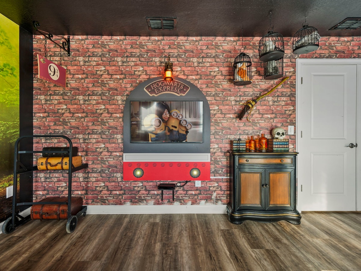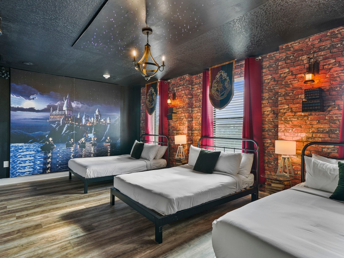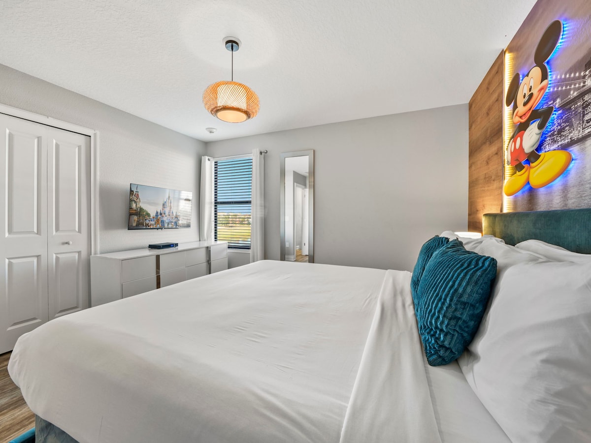 This home features nine uniquely themed bedrooms that add an extra touch of magic to your stay. Kids will adore the Mickey Mouse, Toy Story, Frozen, and Harry Potter-themed rooms, while adults can retreat to the sophisticated king and queen bedrooms, each designed with style and comfort in mind.
