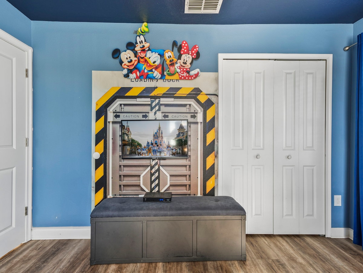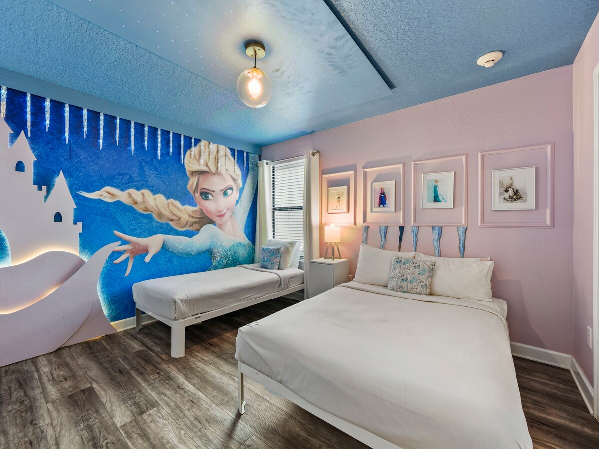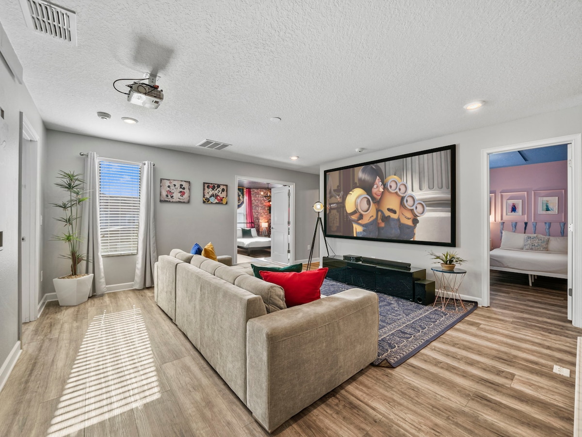 - 9BR retreat offers themed bedrooms featuring Mickey Mouse, Toy Story, Frozen & Harry Potter designs, plus a Marvel-themed game room.