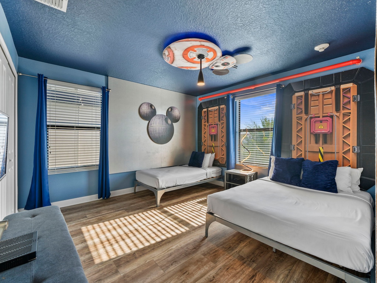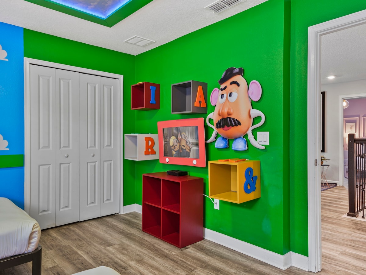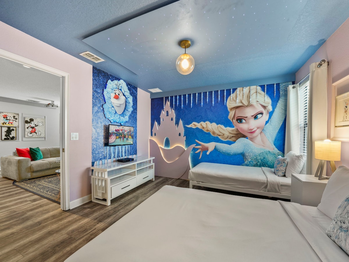 - 9BR retreat offers themed bedrooms featuring Mickey Mouse, Toy Story, Frozen & Harry Potter designs, plus a Marvel-themed game room.