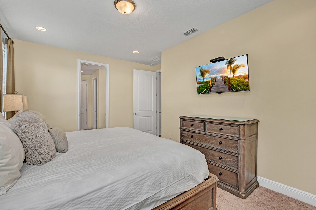 This expansive home features 6 bedrooms, comfortably accommodating up to 14 guests. The master suite offers luxurious furnishings and an en suite bathroom for ultimate privacy. All six bedrooms are equipped with comfortable beds, including one room delightfully themed around Star Wars for the kids. With seven bathrooms throughout the property, all guests can enjoy privacy and convenience, ensuring a relaxed and harmonious stay.