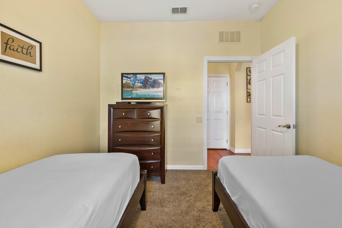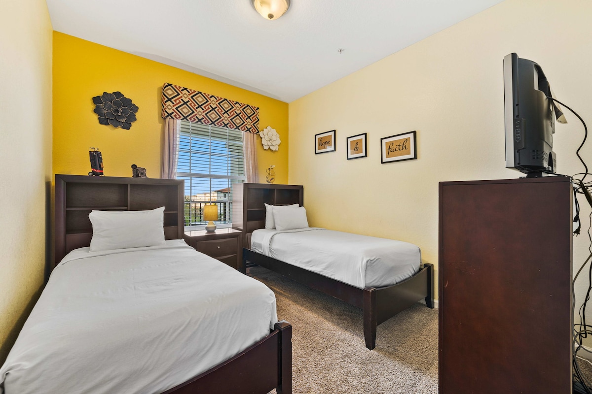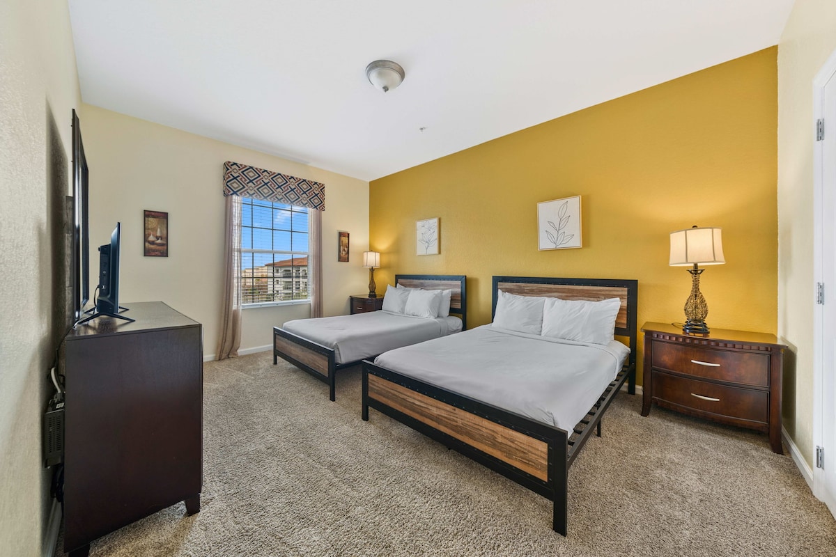 This 3-bedroom condo comfortably accommodates families or groups, with each bedroom offering cozy beds, extra pillows, and soft linens. The master bedroom boasts a king-size bed, Smart TV, and an ensuite bathroom with a double vanity. The second bedroom features a queen-size bed, while the third bedroom offers two twin beds and a bunk bed, perfect for kids.