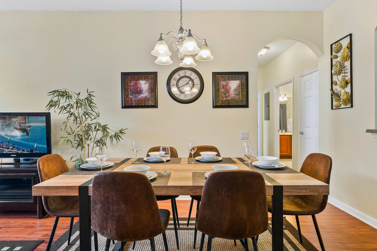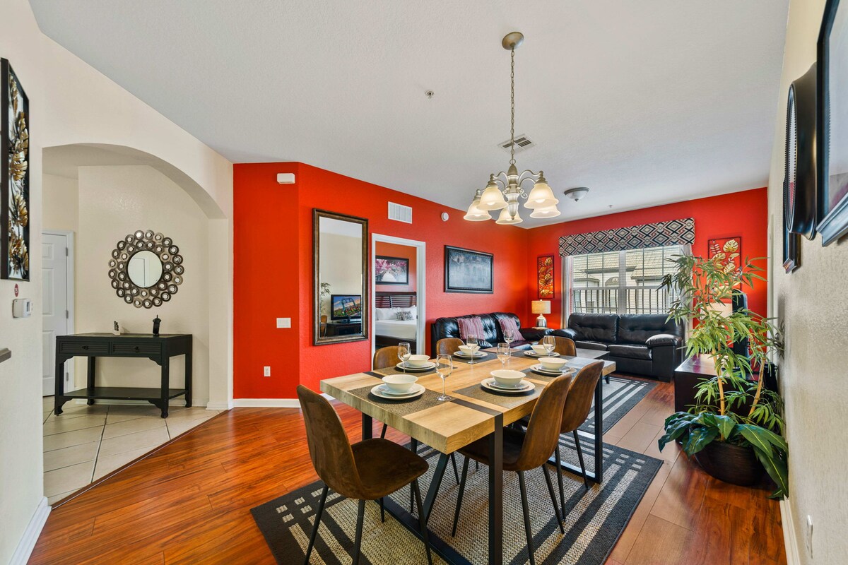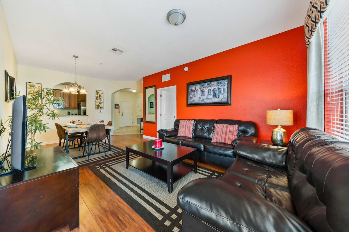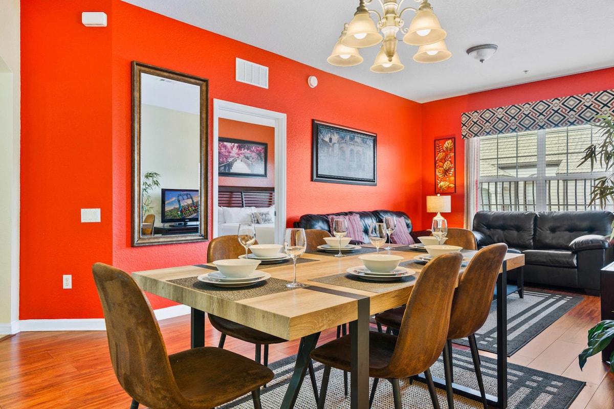 Step into the open concept living area, designed for relaxation and entertainment. The plush sofas and flat-screen Smart TVs create the perfect environment to unwind after a day of exploring Central Florida’s top attractions. With plenty of space for your family or group, this living area is great for gathering to share fun times and stories from your vacation adventures.