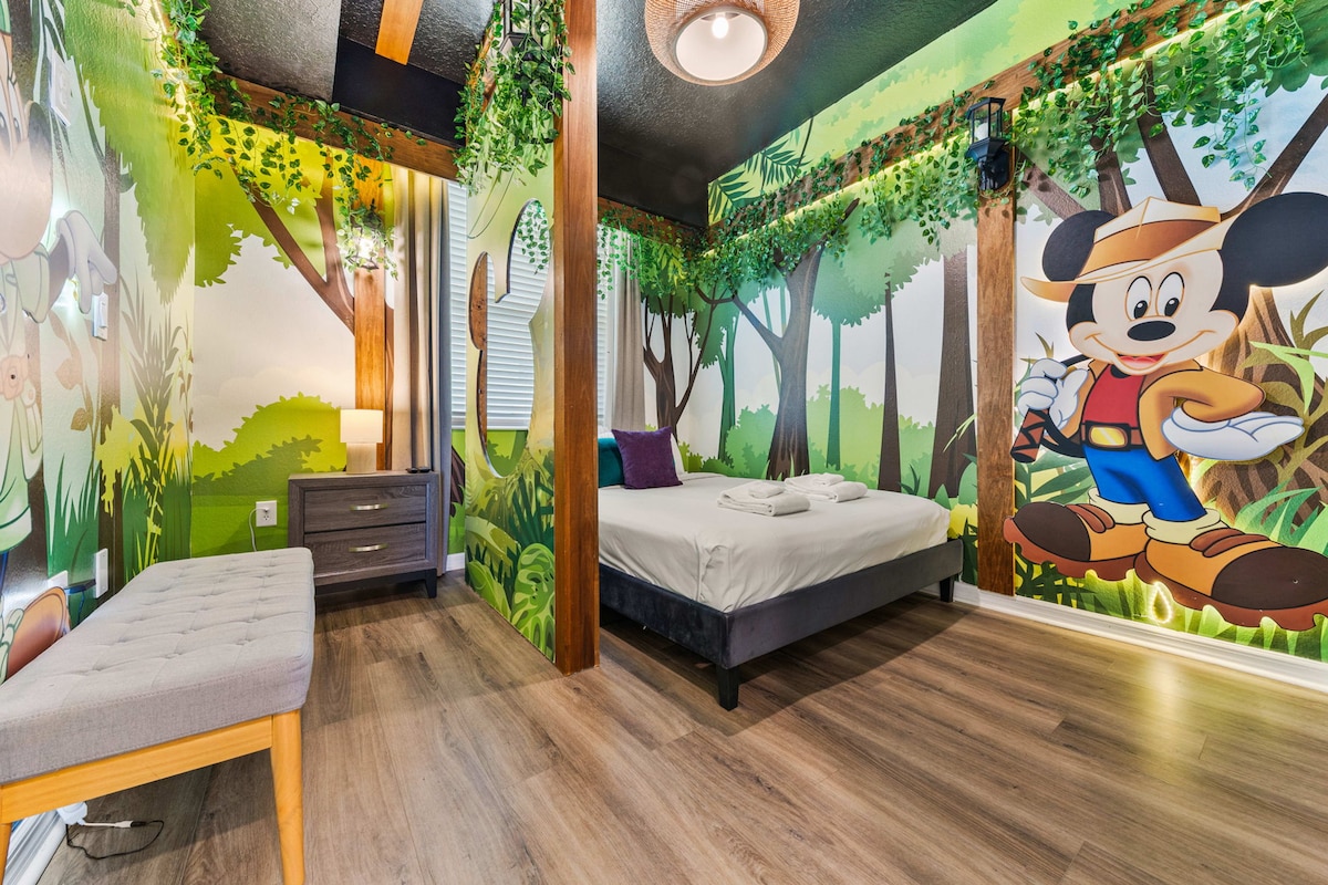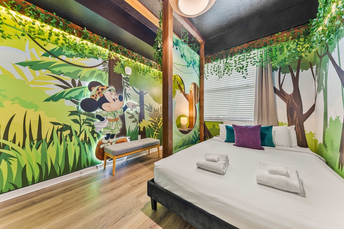 The master bedroom boasts a king-size bed, rustic touches, and an ensuite with a double vanity and walk-in shower. The second bedroom is a Mickey Mouse-themed oasis with a queen-size bed, making it ideal for the young at heart.