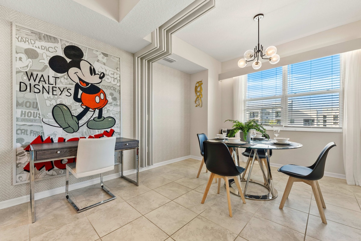 Relax in the family room with cozy furnishings and a Smart TV for movie nights. For those needing to work remotely, a dedicated workspace with whimsical decor, including a Mickey Mouse mural, adds a fun yet functional touch.