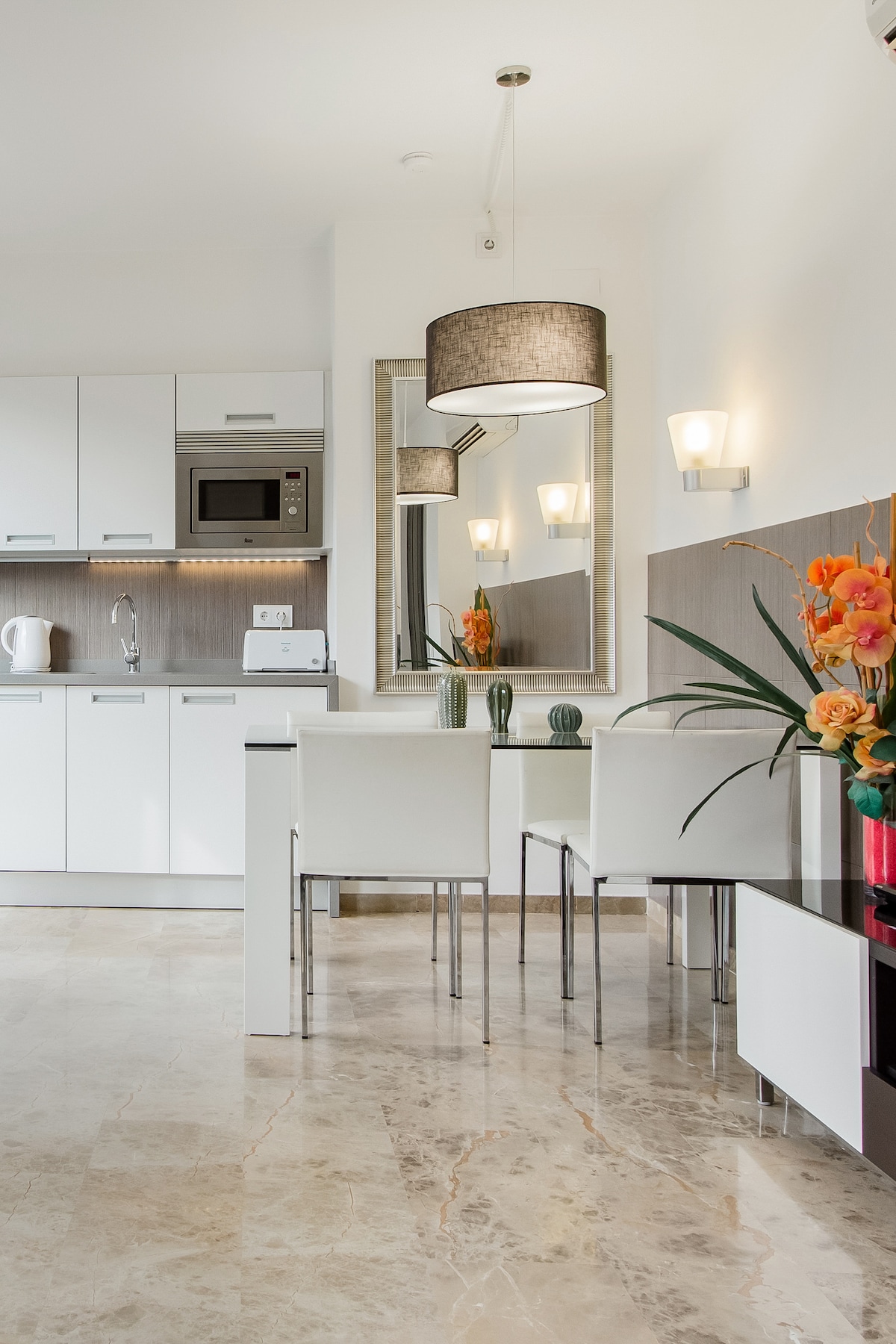 Picasso Suites was absolutely what we had wanted for our stay in Barcelona. The centrally-located apartment was immaculate, decorated in modern tones of white, black and gray with a kitchenette containing dishes and appliances. There was even a vase so we could buy flowers from the charming market next door. The roof-top terrace is an added bonus with a view of Eixample and environs. Can60 is the restaurant on ground level which features a daily light breakfast served by a friendly staff (Laura being our favorite.) Karolina, host Damian Harris' on-site point person, keeps "office hours" every morning in the restaurant answering questions on the apartment or on any number of tourist queries. She is a veritable Barcelona concierge. We availed ourselves of Damian's recommended taxi driver, Andres for our trip to the airport and would ask to be picked up by him next time as well. The six level building has an elevator, staircase and a sweetheart of a manager who will check your bags before check-in or after check-out. There is wi-fi in both the apartment and the restaurant. This home away from home gets our highest travel rating and provided the perfect hub from which to discover Barcelona by foot, bus or metro.