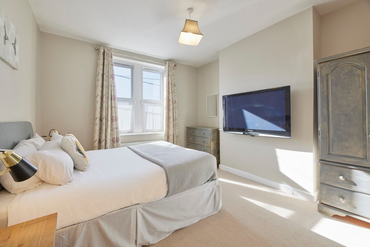 Take the stairs up to the first floor and you’ll find two bedrooms and the family bathroom. Spacious and comfortable, the master bedroom benefits from a king size bed, whilst the second is home to a double bed. Both beds benefit from plush bedding and premium bed linens.