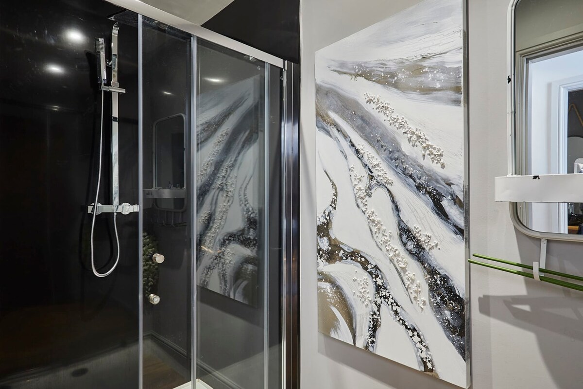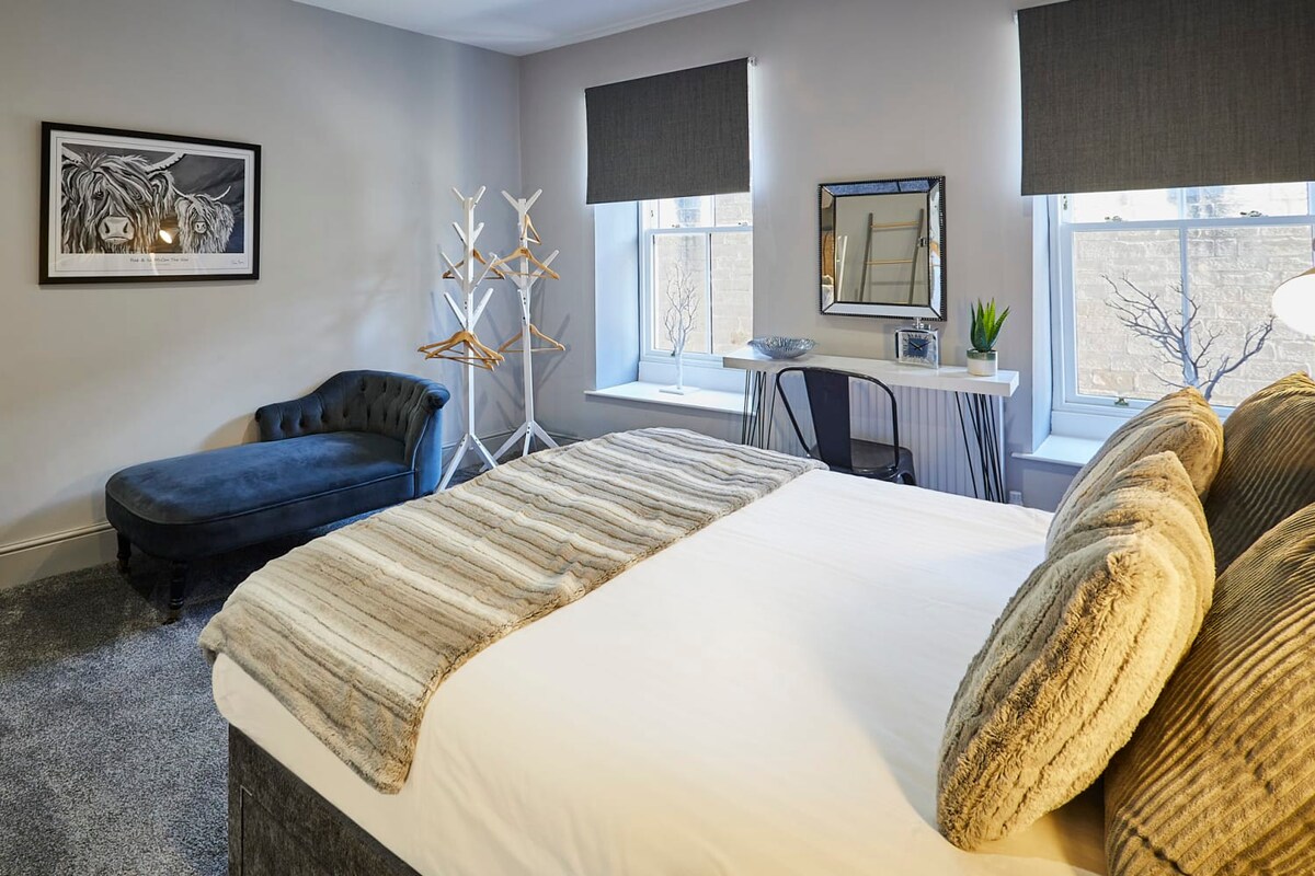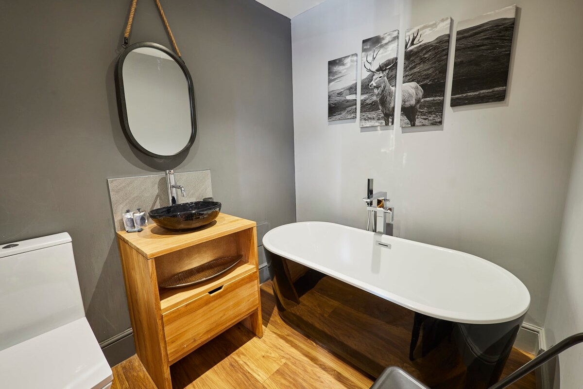 Along the hallway, you’ll find two bedrooms. The master bedroom has a king-sized bed, and the second room is a double. Both bedrooms have comfortable mattresses and premium bed linens to ensure you have a great night’s sleep. There are mirrors, hairdryers and storage space supplied for your convenience.