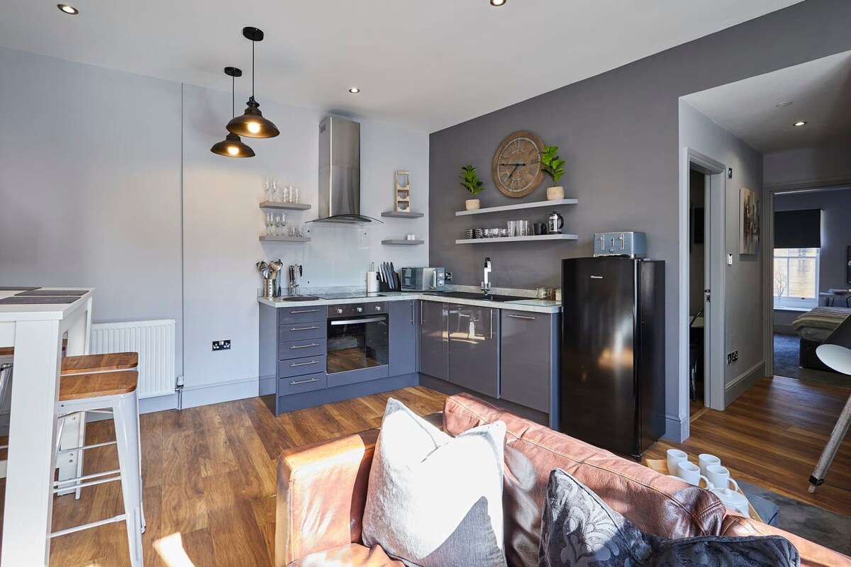 Rooftops Grey is bright and comfortable. It’s the perfect place to unwind with your loved ones. Relax on the sofas watching Freeview on the flat screen TV after a day of exploring Alnwick, which is a short walk away, or an enjoyable excursion into the beautiful Northumberland countryside.Fully equipped for self-catering stays, the kitchen has everything you could need to prepare meals easily. Also sharing the living and kitchen space is the dining area which includes a dining table and four stools.
