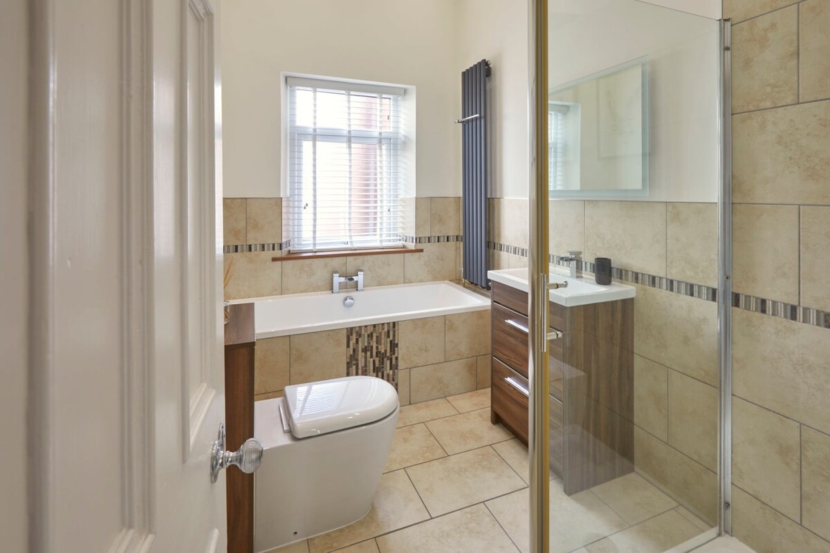 Sharing the first floor is the family bathroom. Featuring a bathtub, separate shower, wash basin and WC.