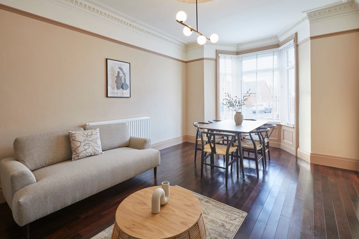 This expertly designed home spans across three levels and features a living room, a dining room, a large kitchen, three bedrooms and one main bathroom. Stylish and spacious, Park House is a well-equipped home, in a beautiful location.The living area features two mustard yellow sofas, an armchair, a flat screen TV and a coffee table. This thoughtfully decorated space is perfect for relaxing after a busy day exploring Blyth and Northumberland.