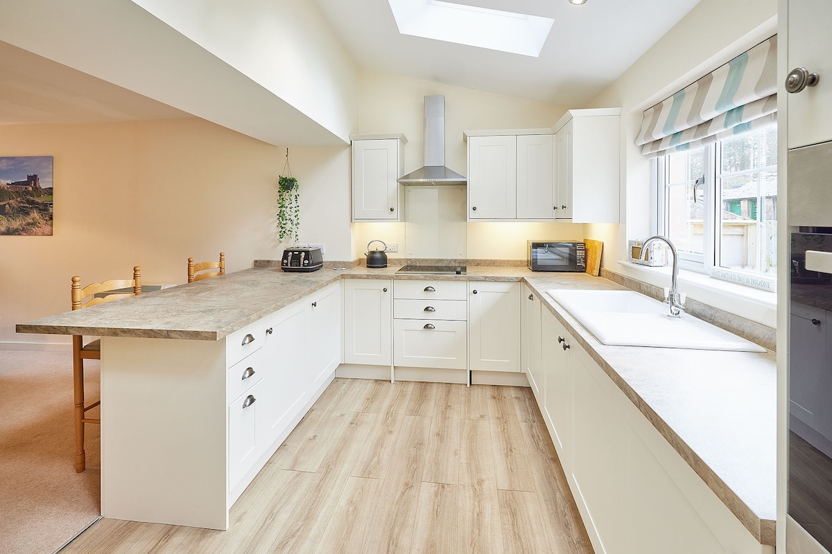 Head out of the living room and you’ll find the open plan kitchen diner. With light coloured walls and a large window overlooking the garden, the kitchen has a bright and airy feel. White wooden cabinets add a somewhat traditional style to the space which fits perfectly with the nature of the property. Fully equipped for all self-catering staycations, you’ll have access to an oven, hob, microwave, toaster and kettle during your stay.