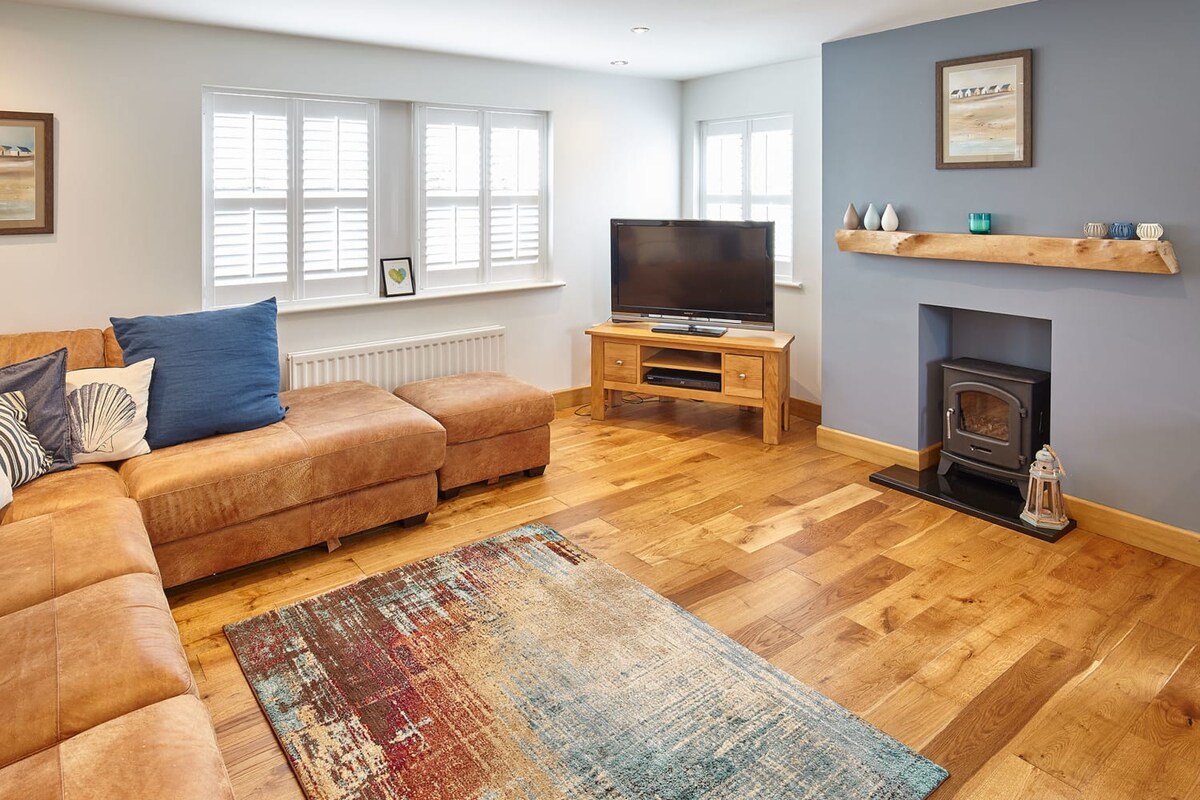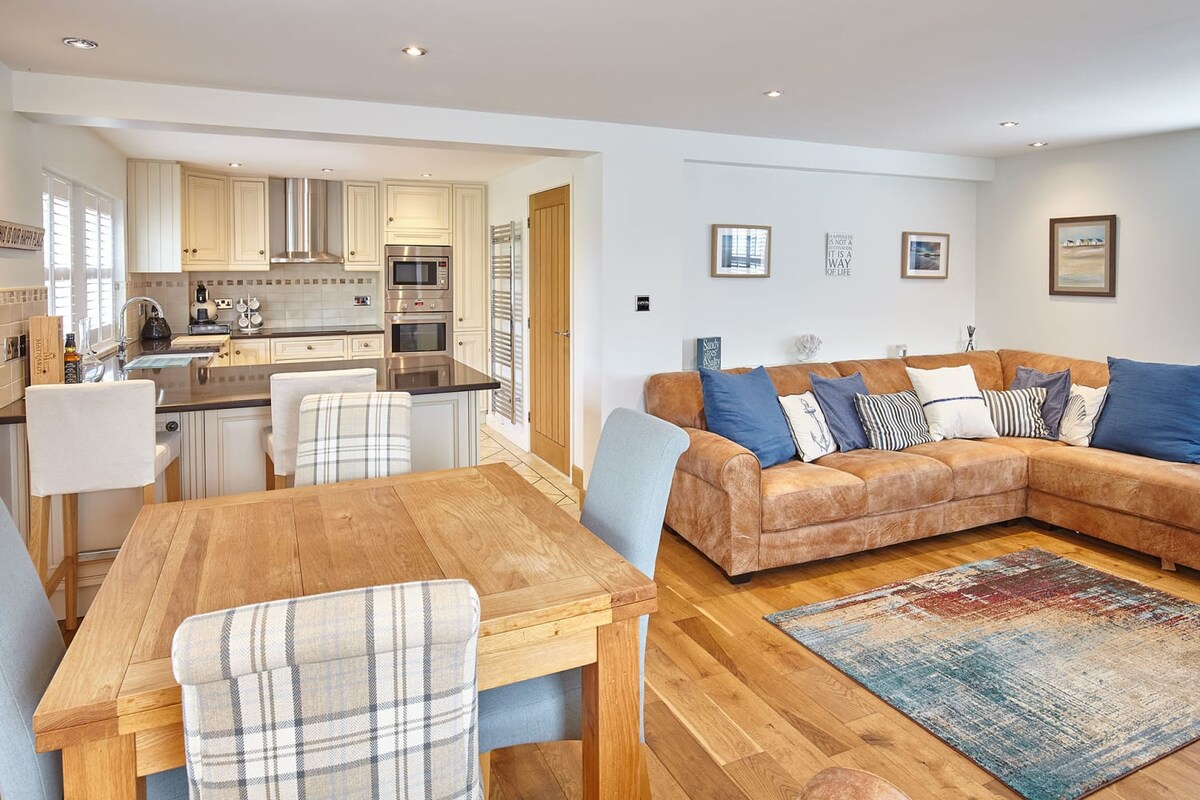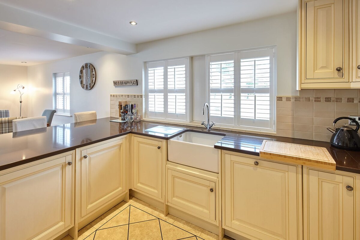 Doray House has a bright and welcoming open-plan living, kitchen and dining room. With a large corner sofa and a flat screen TV, it’s a great place to unwind with your loved ones after a busy day exploring the area.Both modern and traditional in style, there is a fully equipped kitchen with handy appliances and cookware so you can prepare meals easily during your stay. Also sharing this space is the dining area which includes a generously sized wooden table and seating for up to eight as the table is a fold-out one. There is also a breakfast bar with additional seating for two directly behind the table.