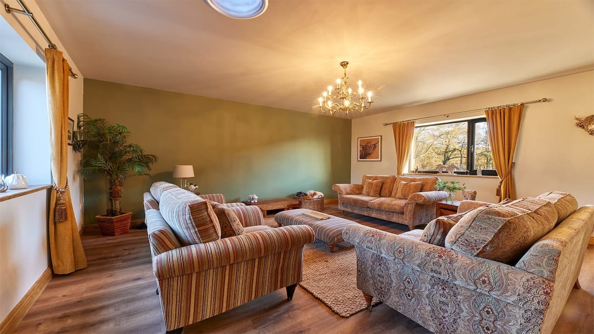 The living room is fully furnished with two sofas, matching armchairs and footstools, all positioned to enjoy socialising with your loved ones.