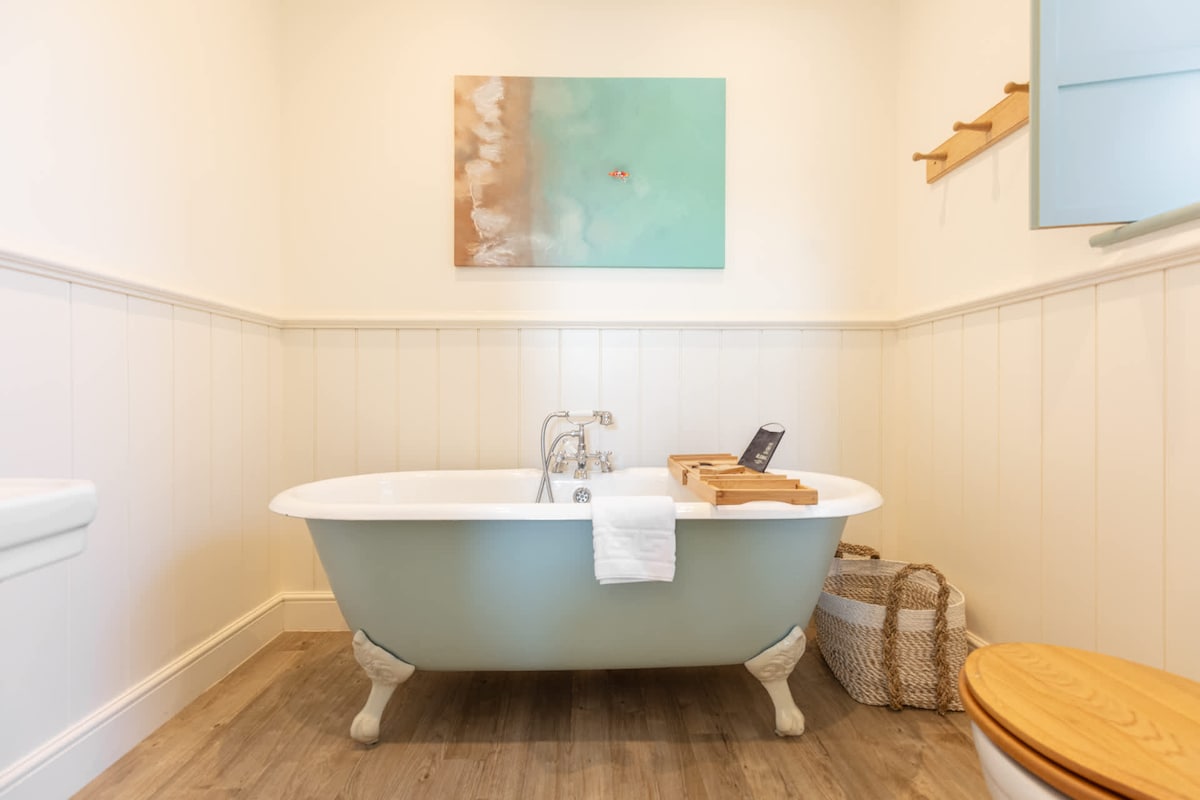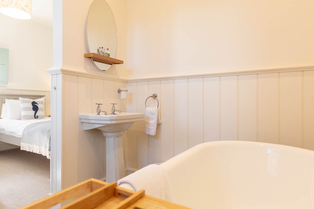 Not too far away is the second bedroom, which offers two single beds, fully carpeted flooring, and your own en-suite bathroom with scroll top bath, WC and basin with oval mirror above. Please note, there is no shower in this bedroom. The pale green, grey and white colour scheme create a cosy and homely feel. This bedroom features plenty of storage space for making yourself feel right at home, and French doors which open up to allow fresh Northumberland sea air to float into the space.